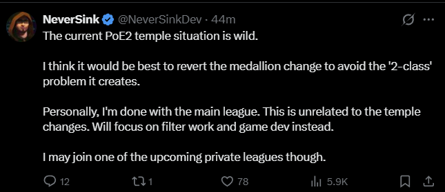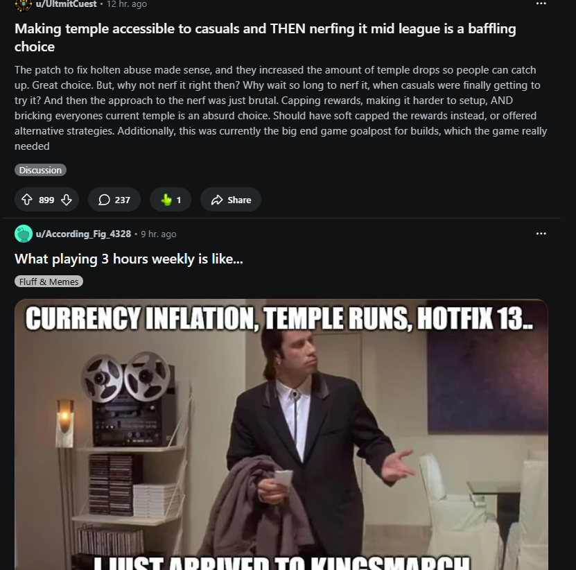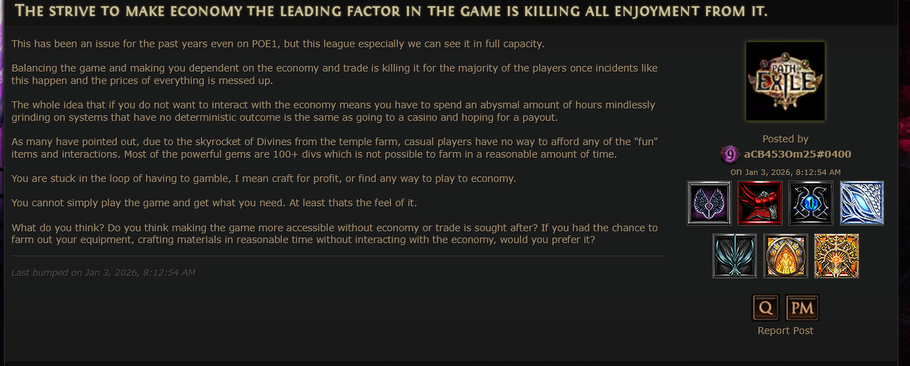 В течение длительного времени команда разработчиков постоянно игнорировала отзывы игроков, в результате чего обычные игроки несправедливо наказывались за честную и законную игру. В частности, в текущем сезоне многие игроки почти месяц активно использовали метод фарма в храме Ваал, что позволяло им накапливать значительное богатство без вмешательства. Однако, как только другие игроки начали использовать тот же метод, он был внезапно и сильно ослаблен, став практически непригодным для использования.