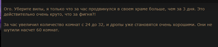 я с храма вышел сегодня утром пошел затестить абиссы под фулл замазом и даже не увидел мобов настолько они хрупкие ничтожные и слабые удовольствия просто не было от лопанья мобов а лут в виде 10 экзов улыбнул вот настолько я раздул чара для фарма храма где у мобов 99999 хп получается храм стал заменой эндгейму который отложили на лигу 0.5 была цель мотивация дуть билд до ебнутых значений а щас на т16 любой фармила храма зайдет и охуеет словно это не эндгейм а 1 акт благо успел побегать эту брокен хуйню и щас могу спокойно сидеть хихикать с происходящего