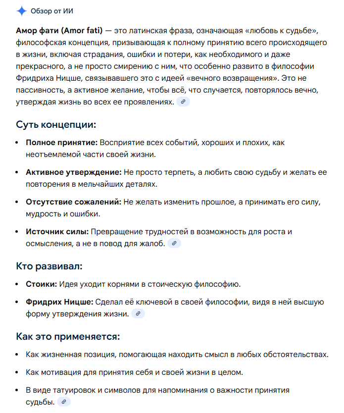 > C amor fati: Ты принимаешь факт: самолет улетел. Это уже реальность. Возможно, это время в аэропорту нужно тебе, чтобы прочитать книгу, встретить кого-то или просто успокоиться. Ты не тратишь энергию на борьбу с прошлым, а с любовью терпением принимаешь настоящее. терпила короч ясно