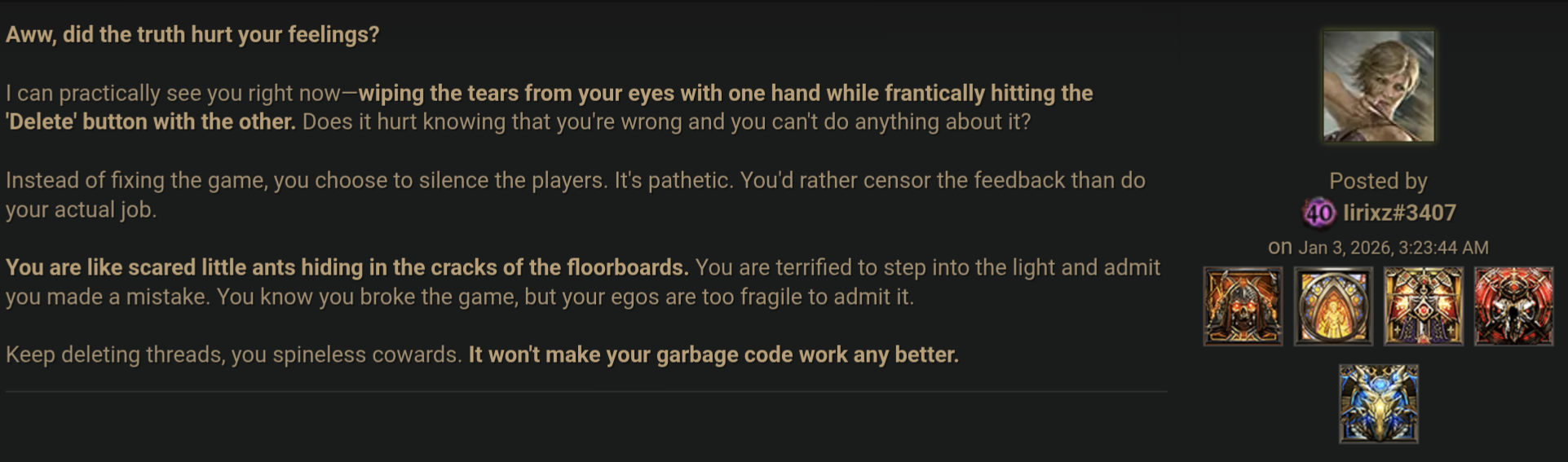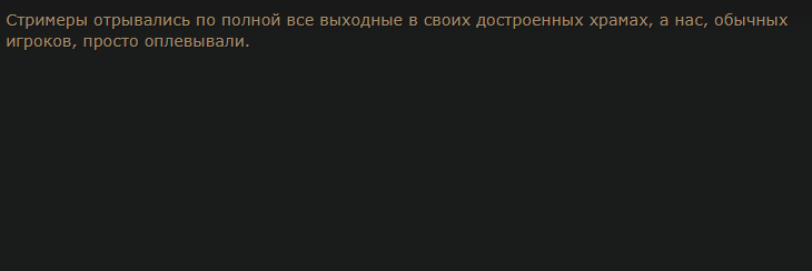 Запишет ли завтра Джонатан видосик с извинениями и обещаниями? Или просто патчик выпустят, где дают подачку в виде 1 жёлтой шмотки в храме гарантированной?