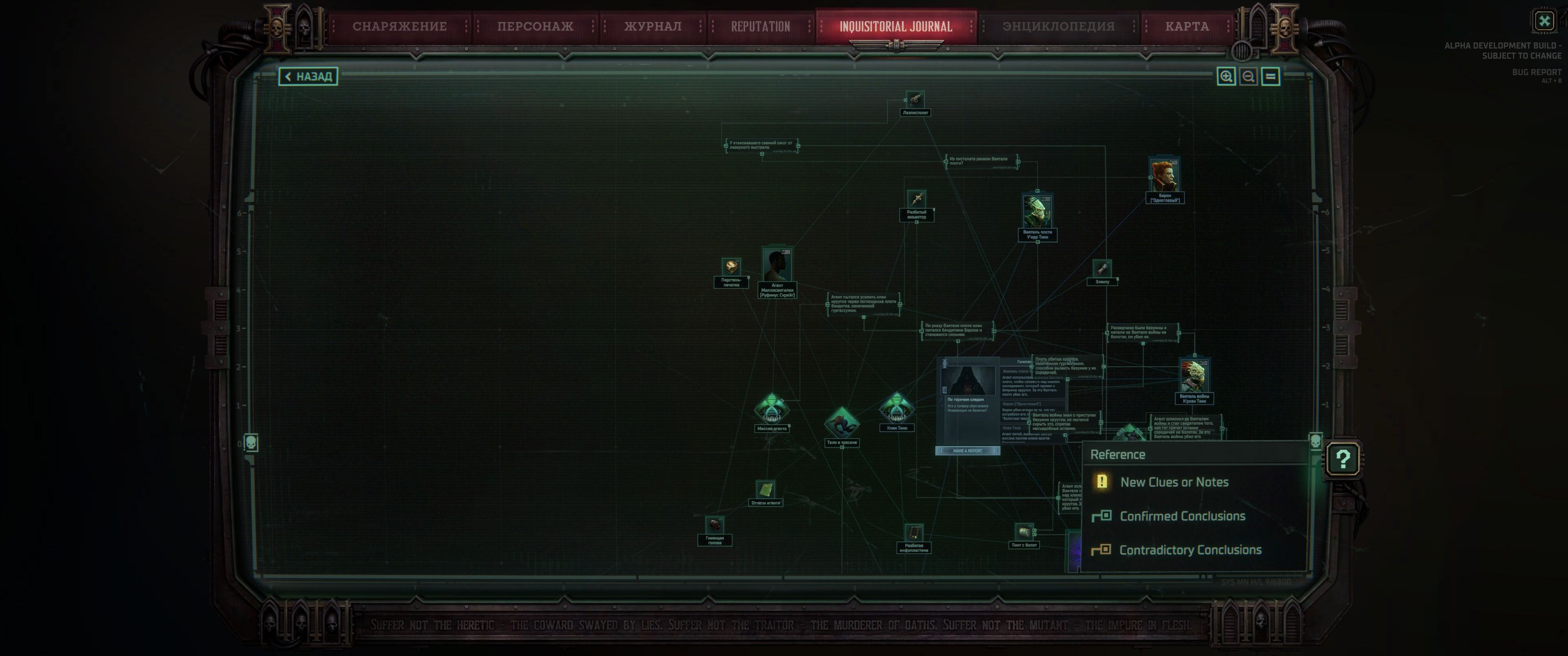 Я так до конца это дело и не раскрыл. Тело агента найденное мной на болотах не имеет зелёных выводов, только жёлтые. Значит, я где-то что-то пропустил. Башку я его нашёл, но наверное ошибся дав попугаихе пожрать его мозги. В дереве-когитаторе я нашёл руку агента с инфотату вроде бы, мне её босс механикусов расшифровал в обмен на делёжку инфой.