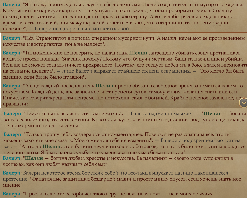 >>50634129 У Вали 9 инты, и она просто проецирует в духе: "Раз мне это не надо, то и остальному миру тоже не должно". Подумать критически тут она просто физически не способна. >>50634214 >Только вот это про "пощажу" присуще не только Шелин но и Саеренрей. А вот нихуя. Базированная Сарочка учит проявлять милосердие лишь к тем, кто хочет и может исправиться. Поэтому, например, некромант в квесте Зоси или культисты в квесте с Халом огребают безвариантно.