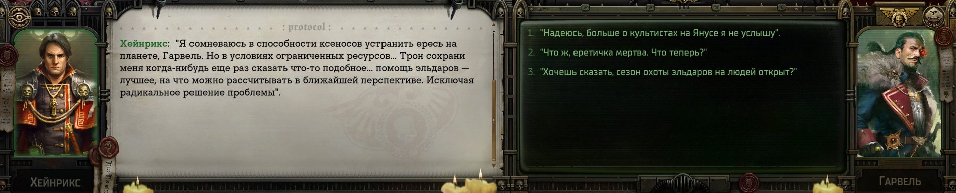Зашел поиграть, до первого босса всё легко. Ладно, дали командовать и сразу возникли вопросики. Самый важный: я могу отыгрывать дохуя блюстителя чистоты? С самого пролога тебе в напарники дают шлюху из хаоса, я могу убить её и всех похожих? А не блокну себе прохождение этим самым? Планирую выкашивать всех нелюдей и всех, кто благоговеет перед оком.