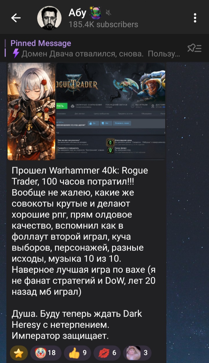 Новости: 1)Начался долгожданный Альфа-тест Dark Heresy - активно знакомимся с новым шедевром. 2)Релизнулся большой патч 1.5 для РТ - ребаланс, переработка колоний и еще много-много всего! Первое длц с компаньоном-ассасинкой культа смерти и расширением корабля — вышло средним. Второе длц, с компаньоном-негром-арбитесом-пидорасом и его летающим киберпетушатником — вышло и оказалось гораздо лучше первого. Третье длц про Тразина Неисчислимого и его бляцкий музей запланировано на апрель–июнь 2026 года. Четвёртое длц про космическую помойку запланировано на июль–сентябрь 2026 года. Список изменений Патч1.5 https://steamcommunity.com/games/2186680/announcements/detail/533239065676349754?snr=2___ Релизный трейлер Void Shadows: https://www.youtube.com/watch?v=hsgKGORxxXc[РАСКРЫТЬ] Релизный трейлер Lex Imperialis: https://www.youtube.com/watch?v=Dh9lu23PCiA[РАСКРЫТЬ] 3) Owlcat представила The Expanse: Osiris Reborn, будущая Аction RPG по вселенной Экспансии. Анонсирующий трейлер: https://www.youtube.com/watch?v=pIQifuOTTe8[РАСКРЫТЬ] 4) В разработке следующая игра совокотов по вселенной Warhammer 40000 - Dark Heresy. Анонсирующий трейлер: https://www.youtube.com/watch?v=mmfu_Spm-6U[РАСКРЫТЬ] Альфа-тест: https://darkheresy.owlcat.games/news/ru/8 5) Патч 2.5 для ВОТР с реворком мифика Золотого дракона вышел, заодно появилась GOTY версия со всеми контентными дополнениями. Это последнее добавление контента в игру. Кто ждал финального релиза - это он.