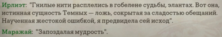 >Чудовище исчезло, и вокруг вновь стало тихо. На столе поднимается пар от свежего печенья и ароматного чая. Арушалай окидывает свою мечту взглядом. Вы никогда не видели на ее лице такой радости. "Я... Просто хочу жить здесь, в мире смертных. С тобой. Я разгадала загадку богини. Вот моя настоящая мечта!"