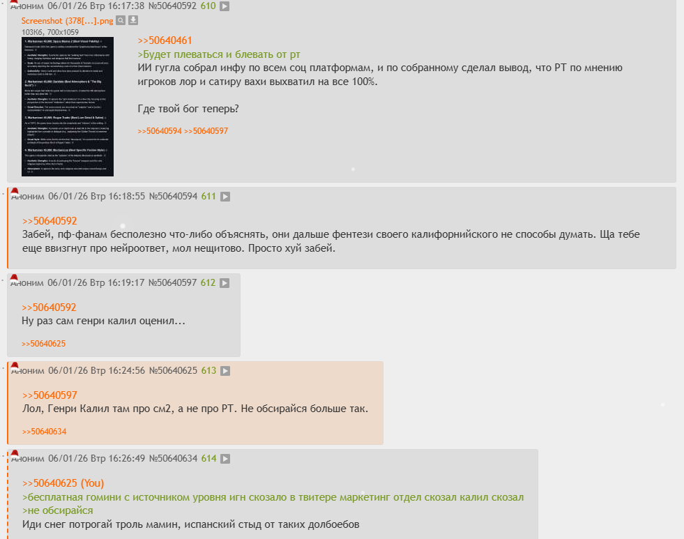 >>50641206 Аргумент про возраст и статус не принимается. Ульфар буквально во втором-третьем диалоге уже называет тебя вождём, просто потому что ты капитан корабля. Ну то есть астартесу который старше доброй части выживших эльфов почему то не в падлу допустить преклонение колена, назовём это так, чтобы человек не чувствовал себя уязвлённым рядом с сыном божьим. А какая то иноземная хуйня нос задирает. И ладно бы это был какой-то старый сварливый эльф из высочайшего сословия, который демонов разъёбывает одним взглядом, яб ещё понял. Но тут буквально чуханка выкинутая своими б/ратьями на помойку, где её без моего вмешательства уже Сланеш на хую крутила бы, под хохот Вьятт и демонеток. Так что нет, Ирка просто ёбнутая, неблагодарная, асоциальная идиотка, её возраст и "положение" тут не причём >Что он за человек ты не знаешь. Небольшой промежуток времени ты с ним путешествуешь, но он все равно для тебя чужак, что по менталитету, что по понятиям жизненным Это всё не имеет отношения к игре. Потому что Ирка перед коронацией сама говорит "ой, НАЗЫВАЕТ ПО ИМЕНИ, ты такой необычный, настоящий нитакусь, и под юбку не лезешь и вообще я хачю с тобой медитировать каждый день". А потом случается: >звонит кузен, который имеет самую худшую репутацию И она тут же сдаёт своего элантаха с потрохами какому-то рандомному хую, который ни одного пруфа не предоставил. Она тупо повелась на разводку ерохи Сук, она буквально за сутки до этого говорила о том, что сожалеет о вреде которые принесли её собратья. Не, чел, Ирка однозначно не в себе. Нормальные так себя не ведут >На тот момент для Ирлиэт гг и его пачка не братики, а буквально рандом аноны Ну как бы тоже не аргумент. Потому что мы не знаем сколько времени совокупно прошло. Но предположим что много, всё-таки события двух актов это минимум треть игры. А если все планеты зачищать то почти половина. За такое время даже к безмолвной собаке привыкнешь, не то что к существам способным на общение. И тем более к существу с которым ты медитируешь как со своим собратом. Но по первой же указке какого-то рандома, ты всех кидаешь под поезд. Это натурально поведение психопата, хаосита, хаотик-ивела, называй это как угодно. Но точно не здравомыслящего существа. Тем более существа претендующего на какую-то там высшесть по отношению к примитивным людям