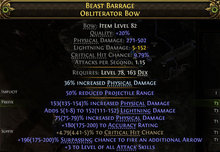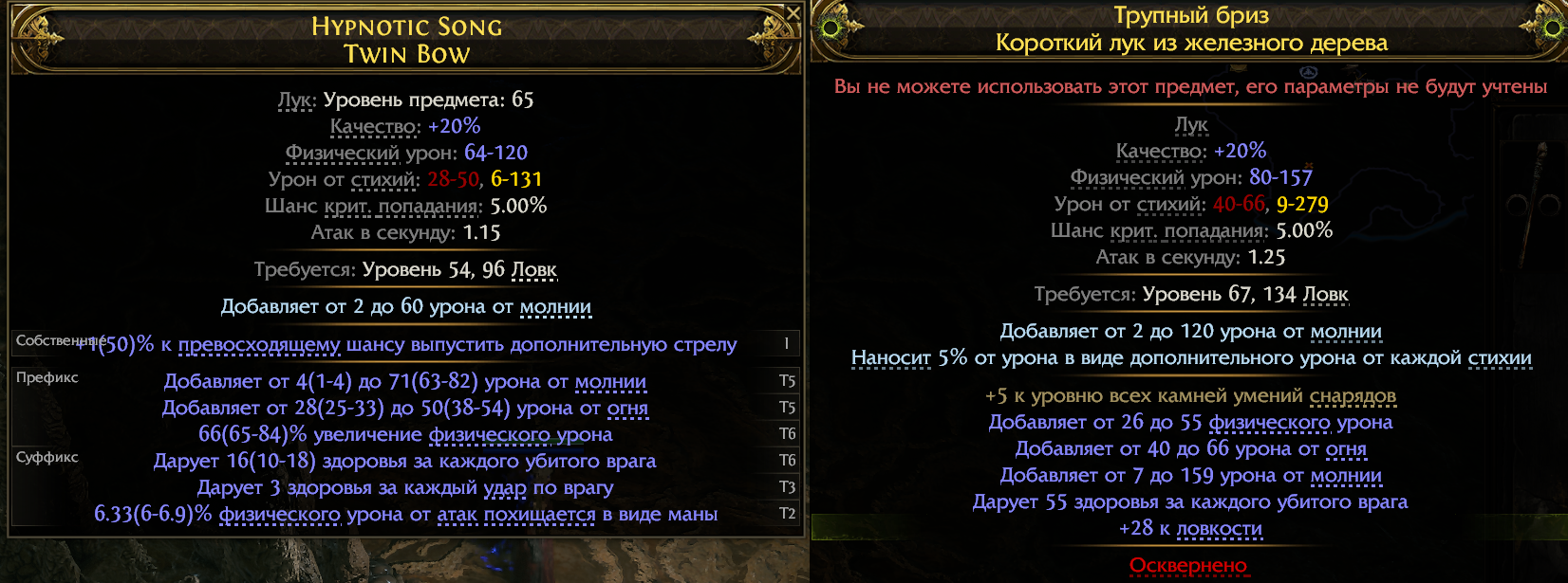Я сделол. Ебать, конечно, небо и земля моей помойной прошлой пушкой на 450 дпс. Здесь вроде ничего не поменялось, но как же решают 3 стрелы. В производство где-то 200 див въебал. Когда все уже было почти готово (с 4мя аффиксами) - экзальт слэм в префиксы дал ебучую аккураси. Пришлось по 17 див покупать омены. Была вероятность соснуть канеш. Но все сложилось. Хз правда что теперь делать с этим луком. Поидее такие на маркете по 400-450 стоят. Но я сбегал пару мапок - и мне очень понравилось. Шкварит так, что мама не горюй.