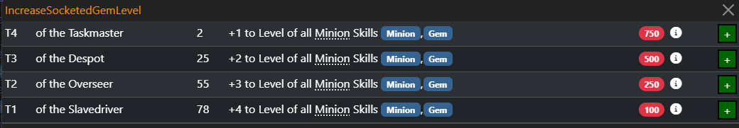 >>50653832 Ну я все равно смысла БАЗ не понимаю. Вот модификаторы, которые применяются к скипетрам. Зачем знать какая база, если достаточно знать, что с 78-го дропаются скипетры с +4 к minion'ам. Другими словами, как будто item level достаточно.