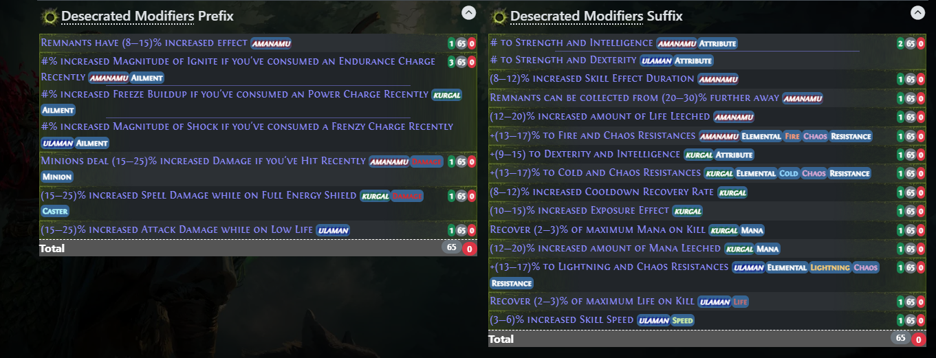 >>50660849 Пое ниндзя, самые популярные билды, смотрел, прикидывал что им нужнее всего. >>50660813 Ссылки не осталось. Могу кратко передать суть. Рекомбинатор очень сильно баффнут в этом патче. Фактически ты можешь с очень большой вероятностью получить предмет с 2мя т1 аффиксами. Также работает перенос с одной базы на другую. Например у тебя есть броня с 3мя т1 аффиксами, а остальные 3 забиты парашей. Делаешь на основе этой же базы другую броню, которую оскверняешь и ловишь там какую-нить т12 ману или т8 резист. После чего, в комбинаторе объединяешь свою хорошую броню, с оскверненной т12 парашей. Шанс успеха = 50% (75% с оменом). На выходе получаешь броню с 3 х т1, и оскверненной маной. Ману стер оменом света, получил броню с 3х т1, можно опять гэмблить, кидая экзальты.