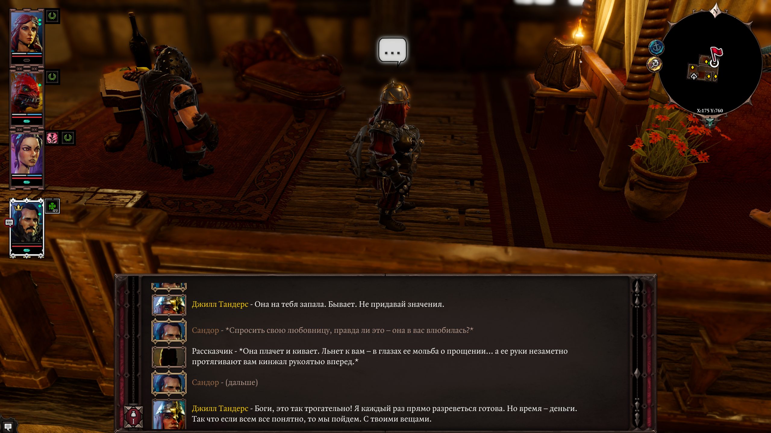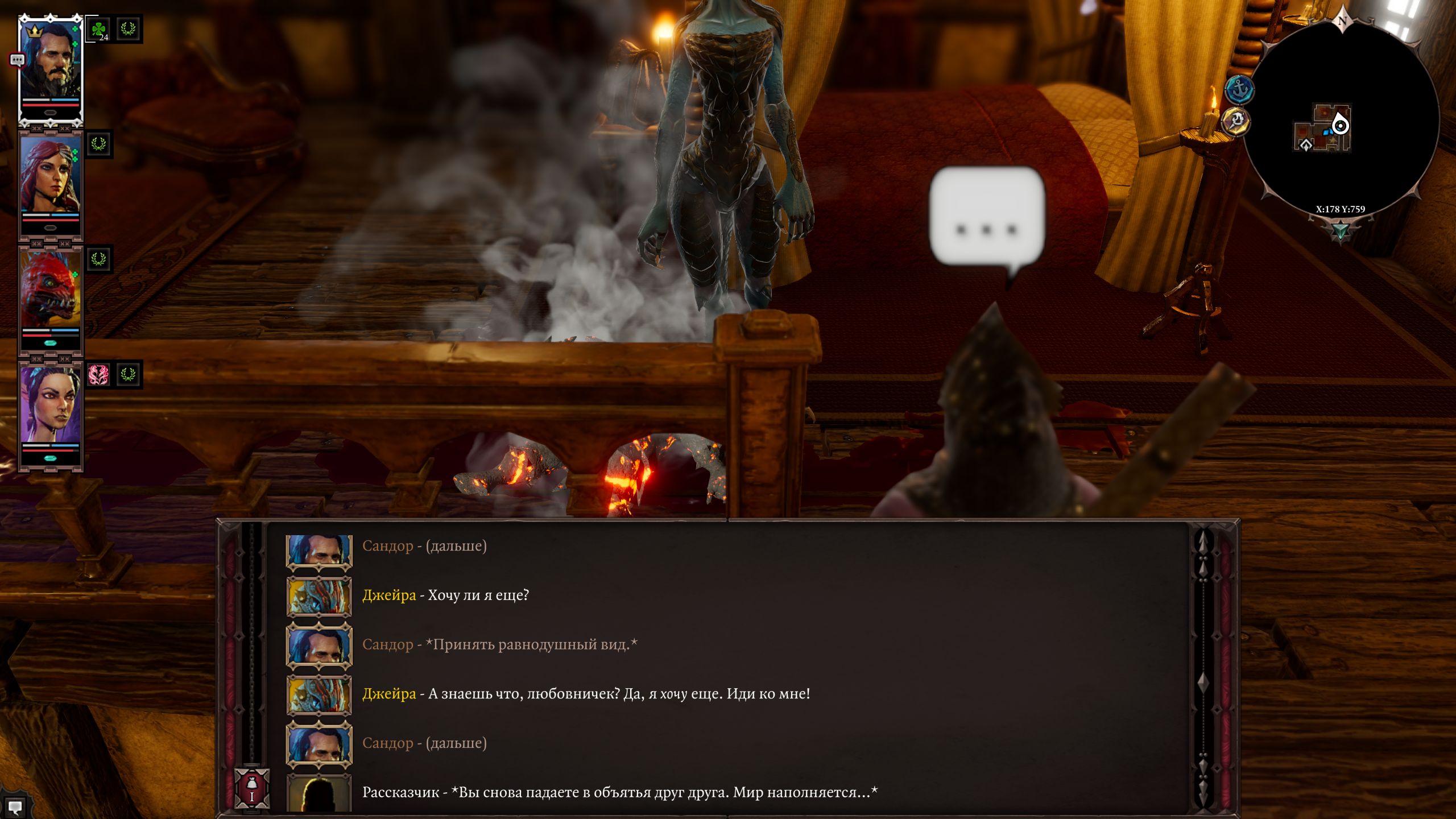 Рерольнулся в хексблейда, скипнул шадуху, забрал лизку, ГЕЙла и вомпера. Наконец то дело пошло, до этого играл просто через силу и мигрень. Что будет если не брать компаньонов к себе? Смэрт? А похуй эти мне все равно не нравились. Пати собирается нормальная. Жабка танкует и ебла бьёт, Гейл аоехи кидает и бафчики, рога на подсосе как роге и положено. И все норм ребята даже не бесят, общаться ну по крайней мере не противно.