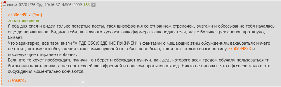 >>50644952 >политшизиков Я оба дня спал и видел только потертые посты, твоя шизофрения со стиранием стрелочек, визгами и обоссывание тебя началась еще до порашников. Видимо тебя, визглявого хуесоса юшкофармера-юшконедавателя, даже больше трех анонов проткнуло, бывает. Что характерно, все твои визги "А ГДЕ ОБСУЖДЕНИЕ ПУКИЧЕЙ" и фантазии о мешающих этим обсуждениям вахабратьях ничего не стоят, потому что обсуждения этих самых пукичей от тебя как не было, так и нет, только визги по типу >>50644823 и последующее стирание скобочек. Если кто-то хочет пообсуждать пукичи - он берет и обсуждает пукичи, как дед, которого всем тредом обучали пользоваться тг ботом или калотарочка, а не серет своей шизофренией и поиском протыков в тред. Никто не виноват, что пфгсисов мало и эти обсуждения моментально кончаются.