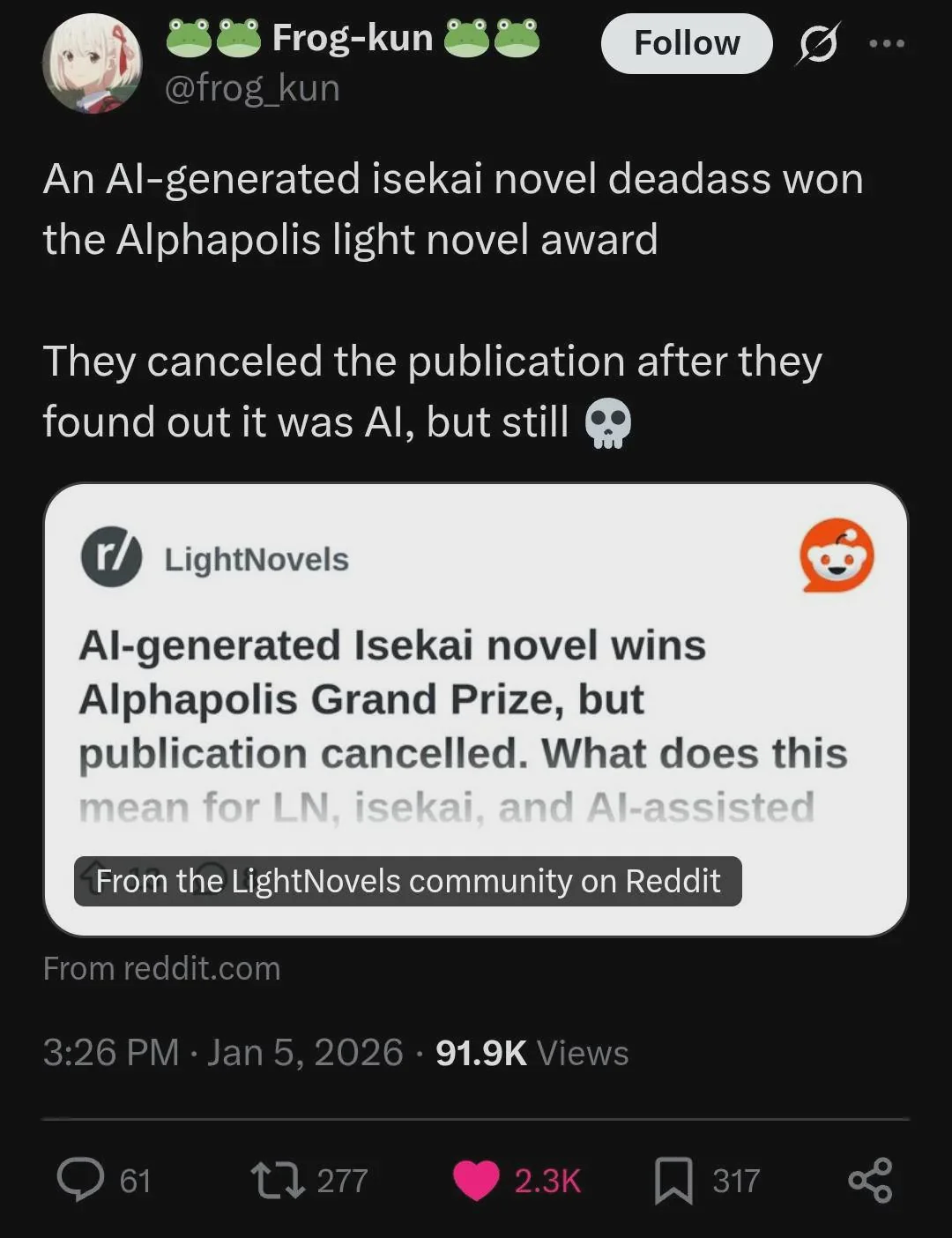 А это что значит? Нет, не то что ИИшка ебать а биороботы сасат. Это значит что среднестатистический потребитель и творец по уровню своего творчества отстают от несовершенного генеративного алгоритма