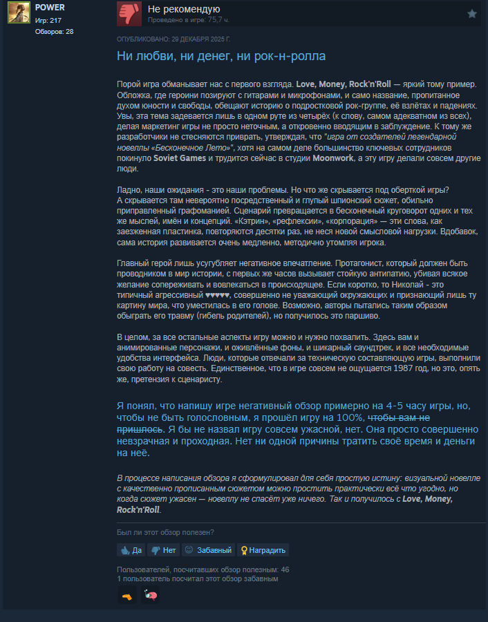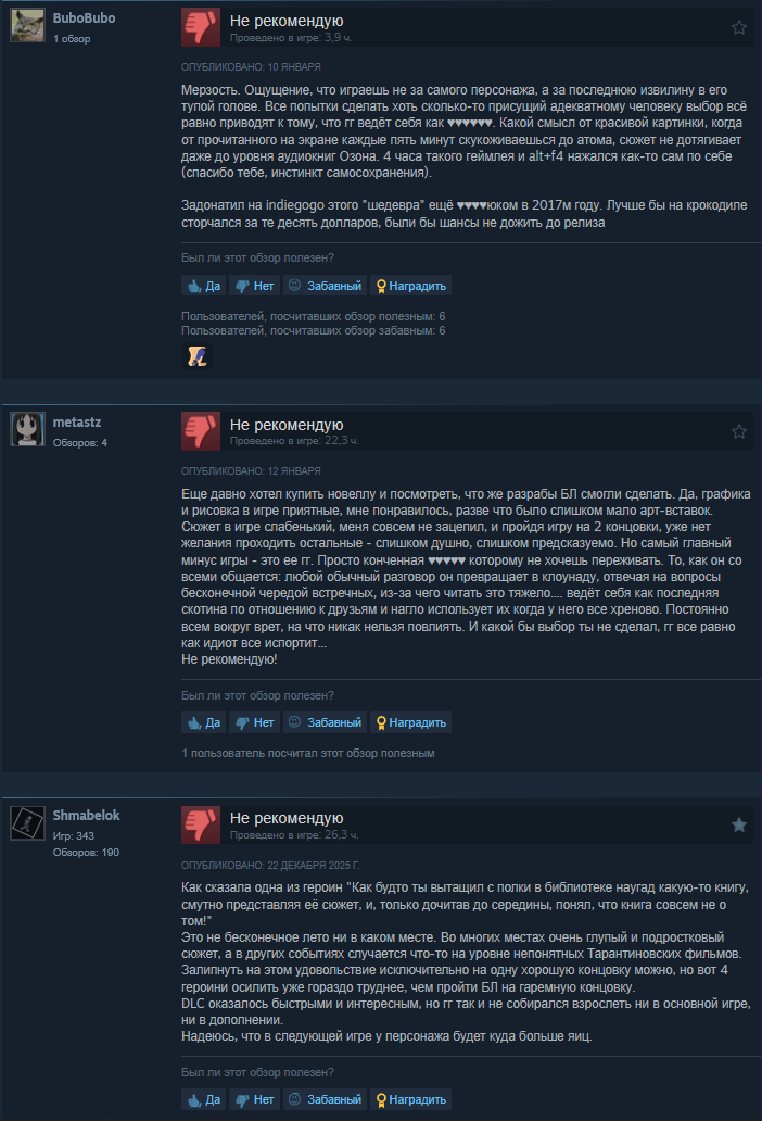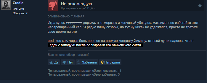>>50645300 → Я пробовал играть, но показалась слишком душной. Особенно, когда я по идеалычам везде хотел сыграть, но откат в сохранениях это откат к началу всего дня и нужно опять всё переделать. Если бы сделали, что загрузка в сохранение в определенный момент грузит, то мб доиграл бы, а как понял, что я ебанусь всем этим заниматься скачал сейв, где открыты все CGI и не особо пожалел, ибо контент не прям, чтобы вах.