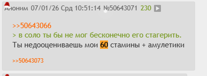 >>50660339 Ну ок, давай на примере самой стамина-френдли игре рассмотрем - Елдарике. Опять же, стоковая дубина для примера. Жрёт 11 стамины за обычный удар, 19 стамины за сильный удар и 28 стамины за заряженную атаку. Самое маленькое количество стамины в игре - 92. То есть, у тебя уже и так со старта минимум 8 атак дубиной при полной полоске. Примерно каждые 10 уровней эндюры будут давать 1 обычный удар, примерно каждые 20 уровней - один сильный и примерно каждые 30 уровней - один заряженный. То есть, от 8 до 50 эндюры (софткап) ты получишь 63 стамины. Это 5 обычных атак, 3 сильные и 2 заряженные. Но это сферический конь в вакууме, если ты как аутист вышел в Лимгрейв и сидел 42 уровня фармил и кидал чисто в эндюру.