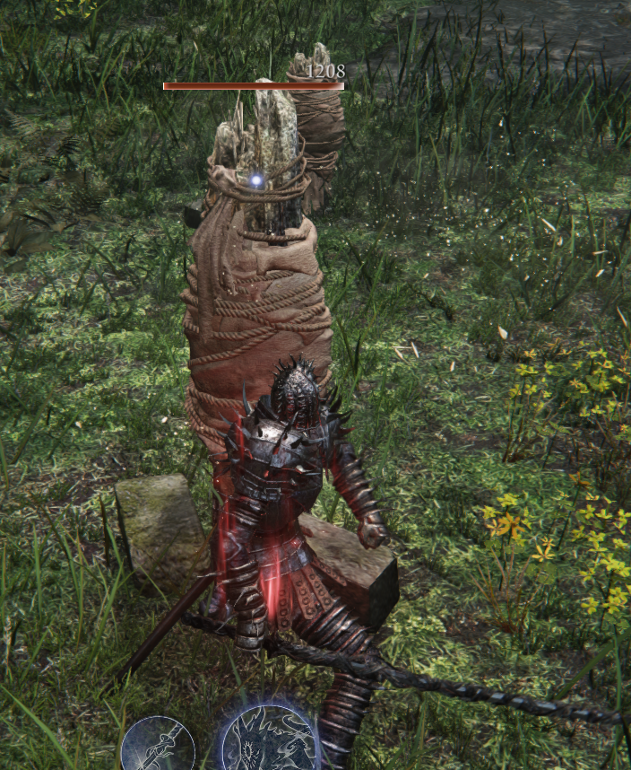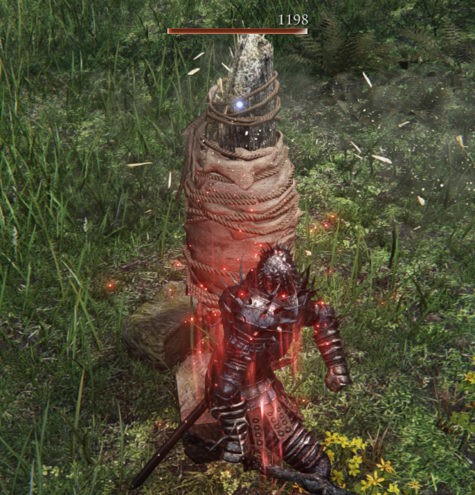 >полупидр-полупень унижает под каким-то деревом Их штук 8 по игре примерно, с каждого падают слезы для чудесной фляги. У деревьев этих на карте нарисованных всегда есть слезы, в локациях-руинах всегда есть подвал с ништяками. Алсо, мувсет у пня простой, у него не так много атак и с хорошими таймингами для уворота все. Когда подпрыгивает - убегай назад, когда кастует золотые звезды - беги вбок просто, ни одна не попадет, а остальное по классике роллом доджится и между его атаками есть место для пары-тройки твоих. Можешь огнем еще смазать клинок.
