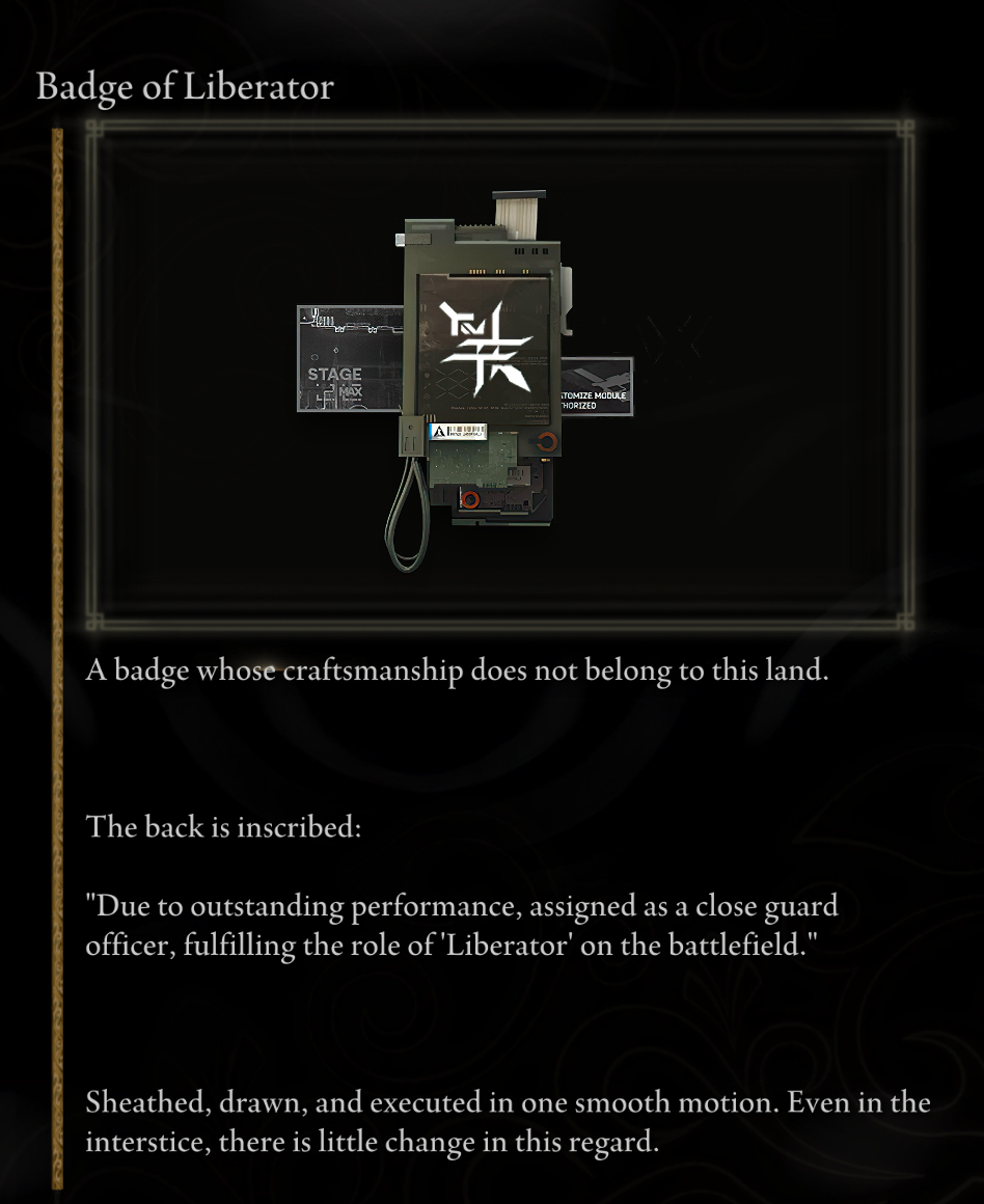 А ну ещё это как бы одно из немногих неанимешных орудий в игре. В соулсах как бы тоже большинство оружия особенно мечей было анимешными кусками стали или ещё чего, но там хотя бы дизайн был такой нацеленный на мрачность, темноту, скелеты кладбища и все такое готическое. А тут чисто цыганская тема в дизайне оружия и вообще игры, все золотое нахуй с позолотой, как зубы твоей бабки