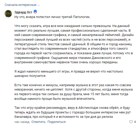 Паталогия 3 чисто по классике "у семи нянек дитя без глазу" - понабрали каких-то упырей по эмиграционной тюрьме или общаге и насочиняли хуеты. Диалоги - утомительная параша, можно было лаконичней, геймплей - унылый дроч костров и мусорок, повествование - рваное как жопы бэкеров. Отдельно проиграл с шабнак, показанной в лоб. В оригинале зло, с которым сражается игрок, не имело оболочки. А тут нате, байтите ее на костры, ебать шайкины рты.