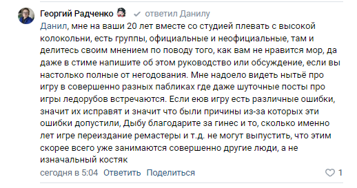 Хз, Дыба - нарцисс и опёздол, но у него есть эстетские принципы и видение, за которое он будет стоять. Я не верю, что он просто уволился по бумагам, а на деле курировал мор-3. Он бы таких уёбищных решений не допустил. При Дыбовском может выйти и бОльшая хуйня (типа копро-Франца), но даже во Франце есть вот эта искра ебанинки, самая крошечка, самая искорка от сварки из той эпохи, когда были ТЕ САМЫЕ Ледорубы. В Море 3 никаких искорок нет уже. Нету Николая.
