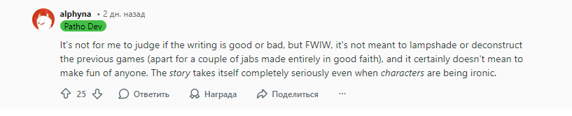 >>50660768 Есть такое, на релизе чекал англоязычных стримеров. Не все, но многие ныли, что читать много, и либо скипали диалоги, либо читали быстро-неразборчиво-по-диагонали. Ну и в чатах спамили, мол, хули это за reading simulator, давай что-то нормальное.