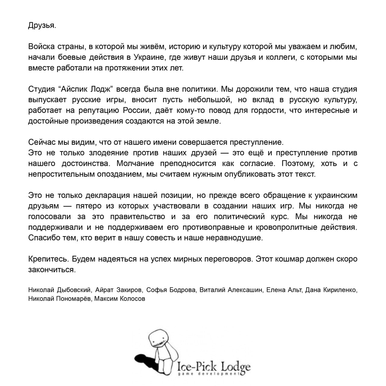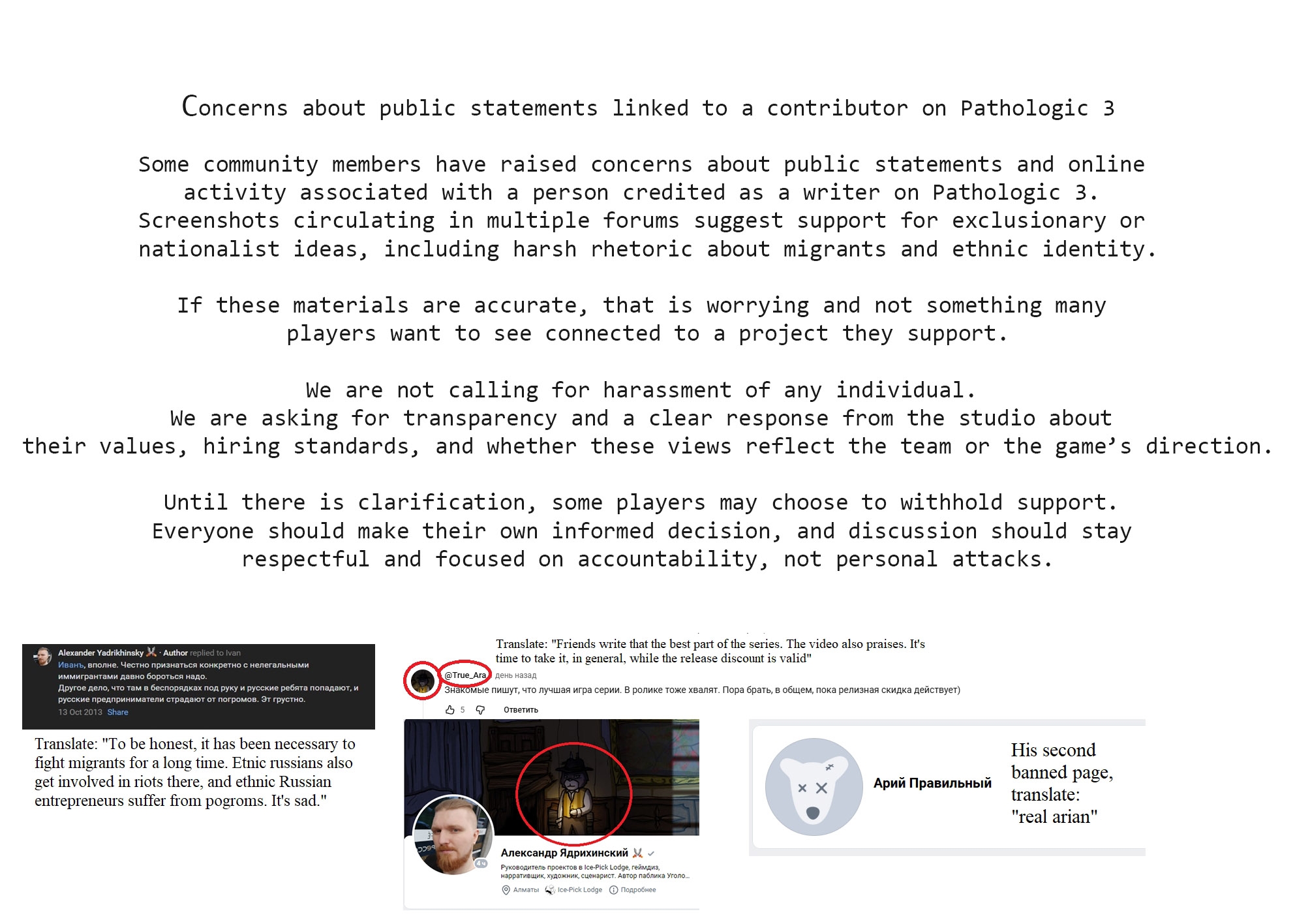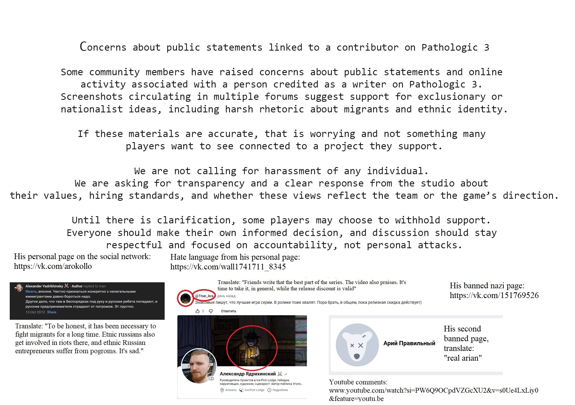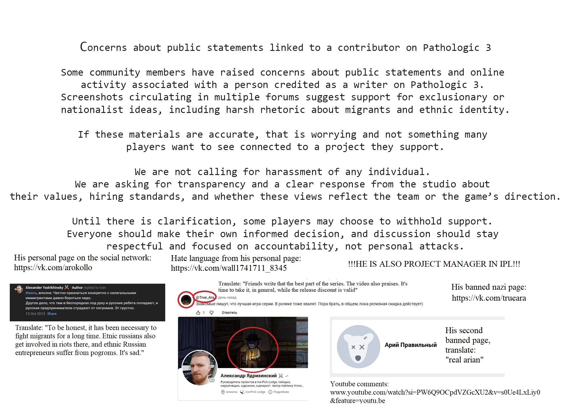 >>50659780 Дыбовский в 22 году делал политической заявление, подписав под ним не только себя, но и большую часть шайки. В 25 ситуация поменялись, и когда соавторы в треде обратили внимание, что органам будет интересно почитать, буквально через пару минут письмо пропало по ссылке. Впрочем, сейчас в шайке при разработке нового огрызка участвовал очень политически активный писатель, и судя по скринам, политоты в игру он тоже немало залил.