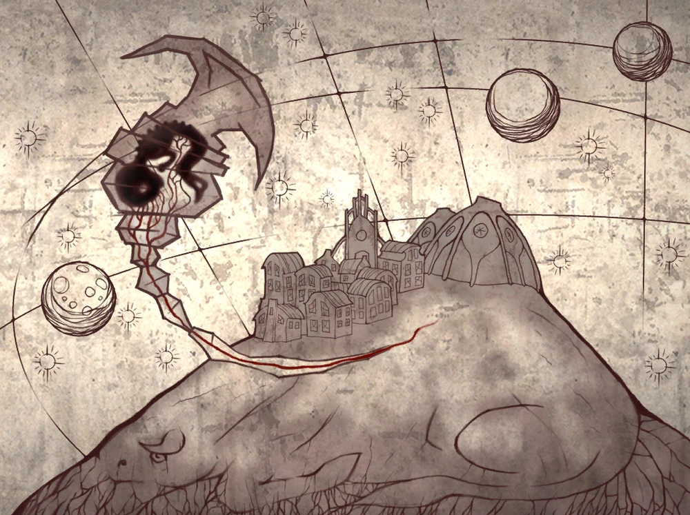 Наверное это дань уважения оригиналу - Мор:Утопия. Там у каждого героя был свой вид города как на пиках, угадайте кто как видит.