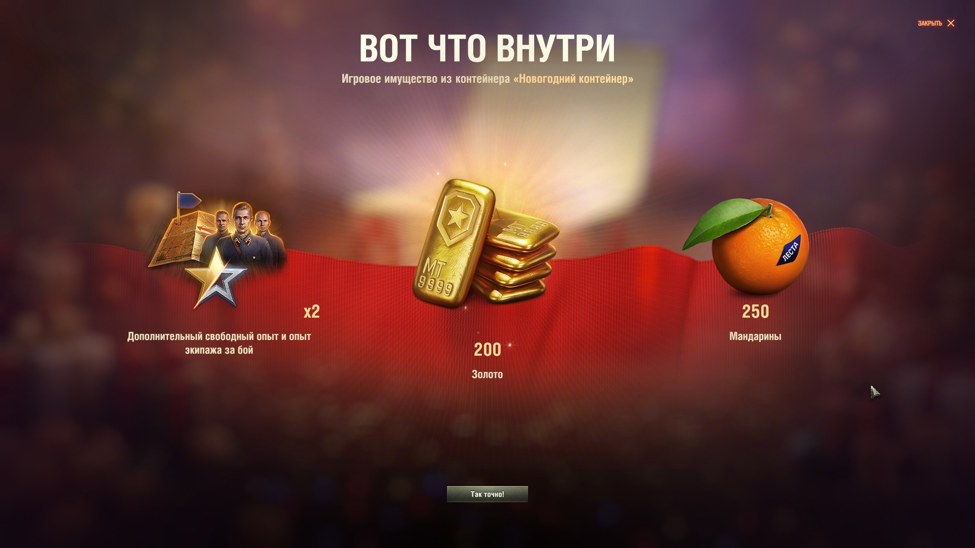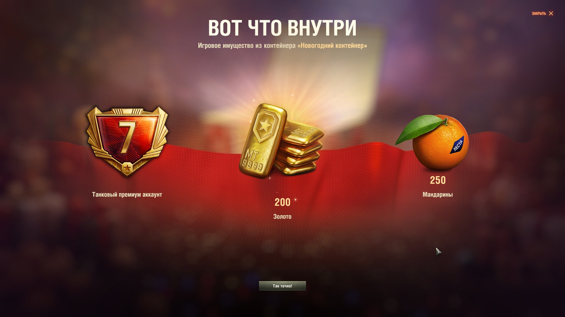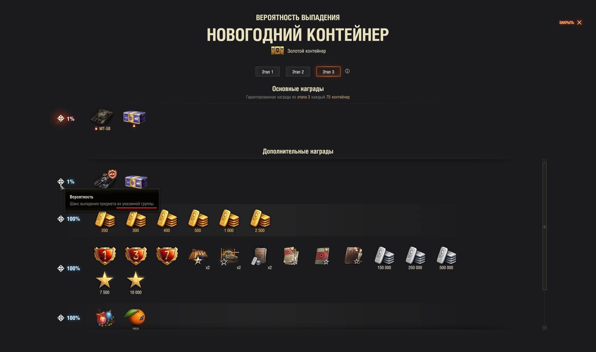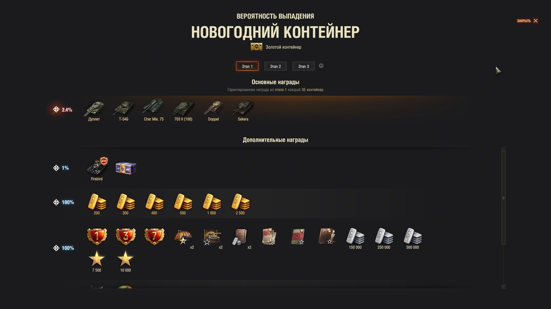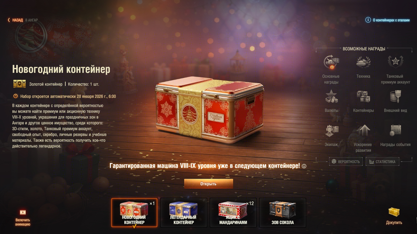 Такое ощущение, что шанс синего контейнера процентов 90, а шанс Файрберда - 10 в этой группе. И тогда получается, что вероятность достать из новогодней коробки Файрберда - это не 1% (как подумают 99% танкистов), а 0.01*0.1=0.001 или 0.1% или в среднем 1 танк на 1000 ящиков. То есть его цена в среднем 86 тысяч рублей. Но это просто пальцем в небо. Реально, шанс его выпадения может быть меньше (или даже больше). Просто лень видео пересматривать и считать.