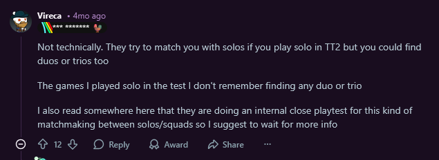 >>50671043 >>50671060 Соло играют онли с соло, не бывает такого чтобы закинуло к дуо или трио кроме одного вечера когда матчмейкер наебнулся, но это тут же починили Дуо играют в дуо, трио играют в трио, у всех свой загончик. В теории дуо и трио могут пересечься, но я за 300 наигранных часов такое видел только однажды, а играл я и в соло, и в дуо, и в трио дохуя и больше.