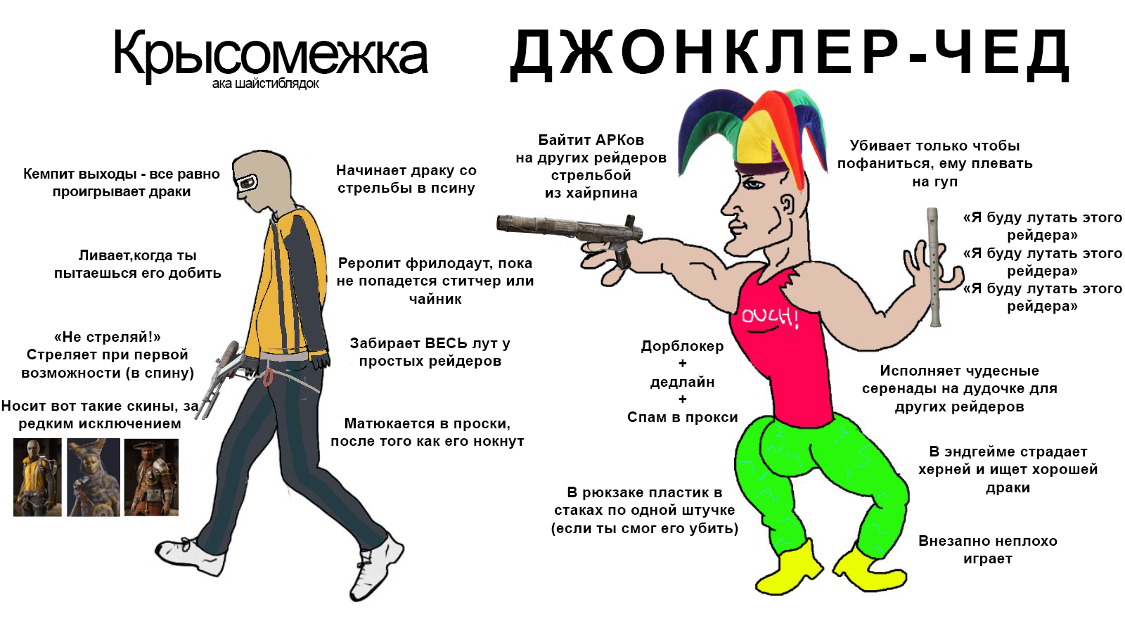 Еще раз для малюток поясняю положняк треда: ПВПШЕР Гоняет по локе в посиках попиздица, ему все равно на ваши ресурсы, он ищет подраца. ПВЕШЕР Любитель популять по тостерам, иногда может подраца, но редко. Не стоит путать с гупером. ГУПЕР ака ЛУТГОБЛИН Любит подраца, но еще больше любит sweet goopity goop, оббирает каждую помойку, все пылесосит, что не может забрать - разбирает. КРЫСА Обычно игрок, который шкерится в тенях, избегает драк и ищет ценный лут. РПШЕР Как понятно из названия, любит отыгрывать роли, что ему, скорее всего, неимоверно доставляет. ХУЕСОС Спавнкемпер/кемпер, сорта говна, может 30 минут дрочить в кустах, сидеть на выходе, будет ждать до последнгей секунды, прежде чем прожмет кнопку вызова. ПИДОРАС Чмондлер, абузящий баги игры, обычно сидящий за стенкой и убивающий оттуда ничего не подозревающих малюток. ГОВНО Притворяющийся твоим другом игрок, который выстрелит в спину, как только предоставится возможность. ДЖОНКЛЕР Отбитый шиз, обычно много пиздит в прокси, либо не говорит вовсе, стреляет во что угодно, неадекват. ШИЗОМИНЕР Любит забраться в дом, где начинает неистово баррикадироваться и минировать проходы. ТРЯСУНЧИК Всегда избегает пвп. Ходит всегда на корточках и осматривает все углы на крыс и злых рейдеров. Если кто-то начал в него стрелять, сразу убегает, чтобы захиляться. Экстрактится в самый последний момент, чтобы снизить вероятность крыс при экстракшене. ДЖОН РЕЙДЕР Безымянный помощник, настоящий ковбой с Наковальней IV, соло бегунок, гид для малюток ахуевозов. МАМИН СНАЙПЕР Занимает самую высокую точку на карте, откуда снайпит все что видит. Никого не убивает, не получает лута, но его это не волнует. Сычевальня обвешана постерами Симпла. БУТИРАН Деревянный по пояс, а то и ниже игрок, которого необходимо водить за ручку ввиду полного отсутствия фантазии, не может в отыгрыш и считает игру законченной после выполнения всех квестов и крафта первой фиол волыны.