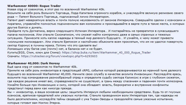 Warhammer 40000: Rogue Trader Новая crpg от совокотов, в этот раз по вселенной Warhammer 40k. Возьмите на себя роль Вольного Торговца, Лорд-Капитана огромного корабля, и унаследуйте великую реликвию своего рода — Патент Вольного Торговца, подписанный лично Императором. Патент дает невероятную власть и почти полную неуязвимость от законов Империума. Совершайте сделки с ксеносами и пиратами, управляйте полностью подчиненными вам колониями и прокладывайте в варпе пути в такие места, о которых другие боятся и думать. Пройдите путь Догматика, верно следующего Истинам Императора… И постарайтесь не превратится в сумасшедшего палача миллионов. Или станьте Схизматиком, что сможет найти компромисс даже в самых странных и тяжелых ситуациях. Принесите хоть каплю надежды в темный мир далекого будущего… И узнайте, к чему может привести «излишнее милосердие». Или станьте Еретиком и настойчиво объясните всем проклятым, что им не удастся повергнуть сектор Коронус в пучины мрака. Потому что это сделаете вы! Ломающих игру багов уже (почти) нет, а баланса нет и не будет. Купить(EGS, Стим, ключ для Стима): https://shop.buka.ru/item/Warhammer_40_000_Rogue_Trader Скачать: https://rutracker.org/forum/viewtopic.php?t=6293603