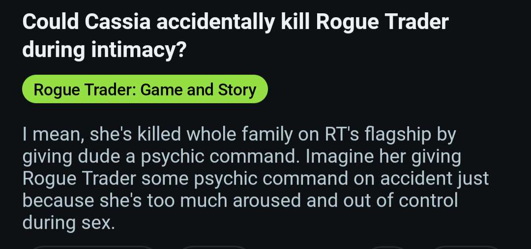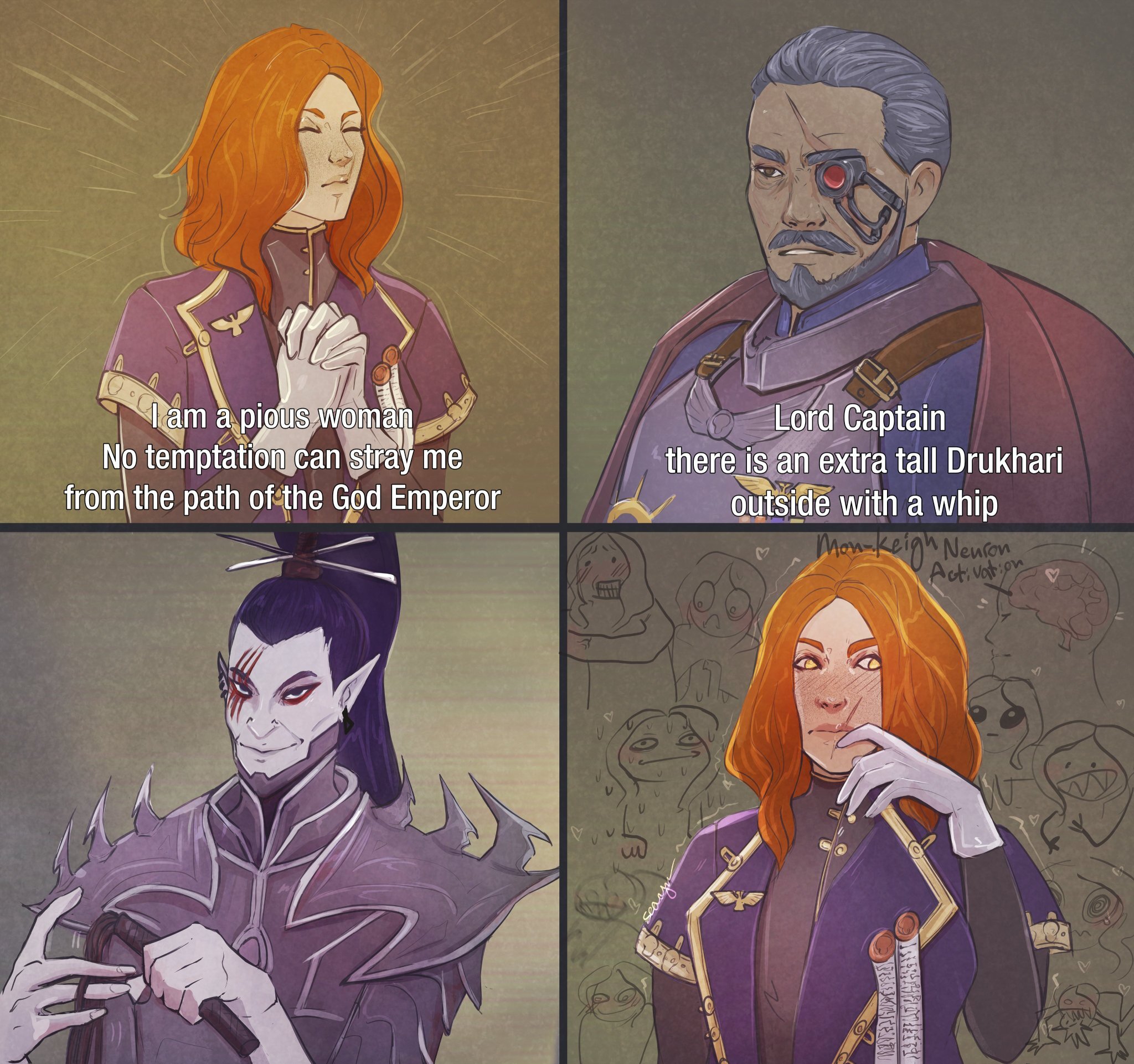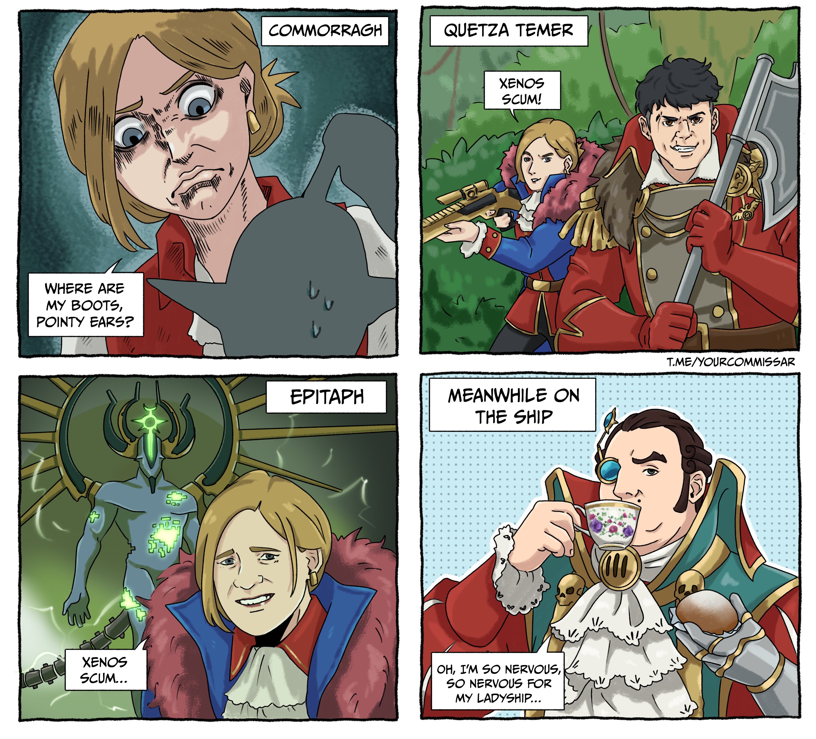 КАЖДОМУ ВАХАЕБУ, ВАХАФАНУ, ЗАЛЕТУХЕ И ЗНАТОКУ ЛОРА ЧИТАТЬ ВНИМАТЕЛЬНО: Совокоты известны крайней разношерстностью своих сюжетов — в одной игре может сочетаться как аниме/трансухи/соя так и самые базированные персонажи. А также известны своим вольным отношением к сеттингу: с Вахой это может вызвать горение жоп. Воспринимайте Rogue Trader как неканоничное произведение или фанфик. Хотите 100% следования "канону" — идите почитайте рулбук.