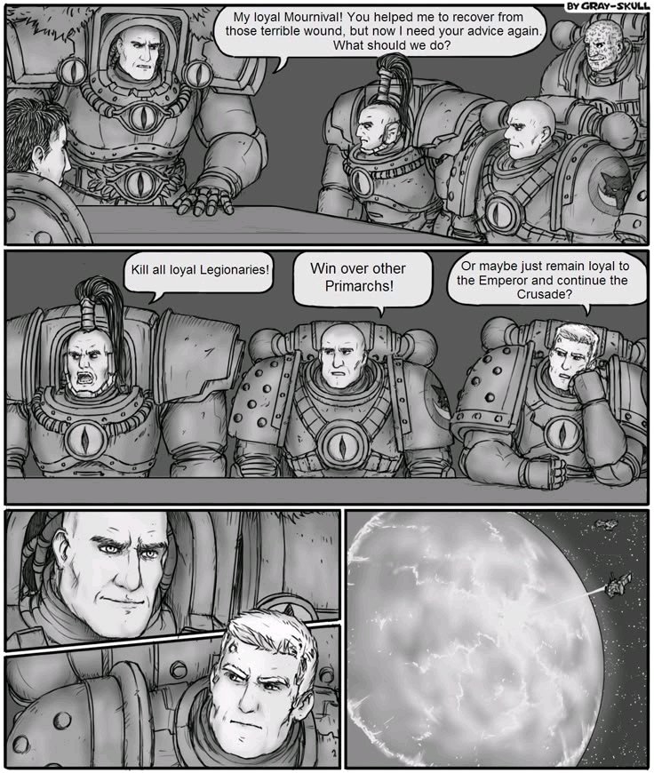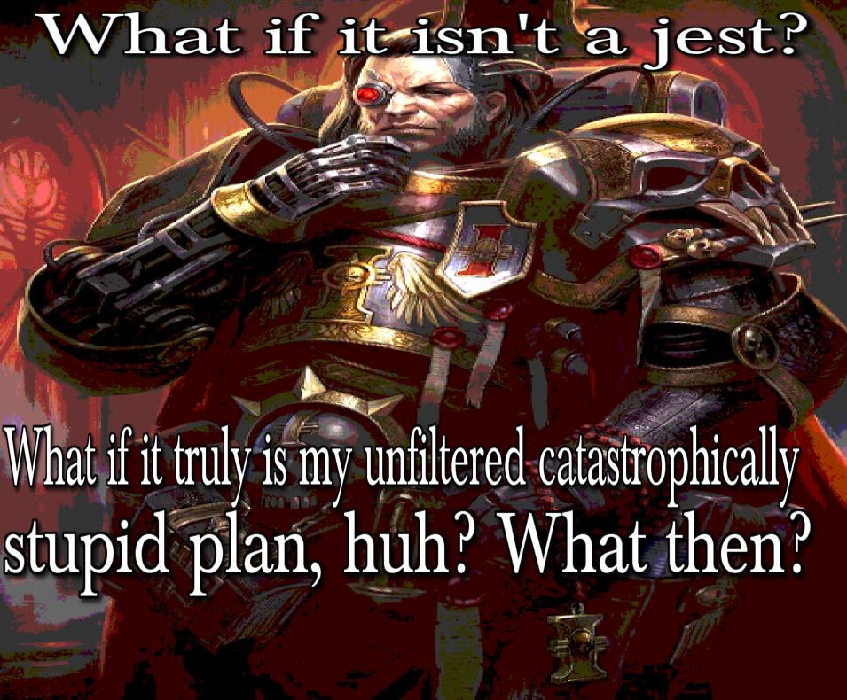 И тут с одной стороны взять бы да и ёбнуть Санбоя, что к тому же было бы адекватно с т.з. отыгрыша (РТ лексиканум не читал). С другой стороны, мы-то знаем, что эта половина Империума погружается в пиздец из-за разлома, так что план Калькасара выглядит уже не столь безумным. Хаос всегда наебёт, а вот использовавший простую советскую некронскую технологию Калькасар ктана при нашей помощи подчинил, прецеденты контроля над осколками есть. К тому же если играть за схизму в общем единственный вариант сохранить свою сраку и свою мини-империю это помочь Калькасару.