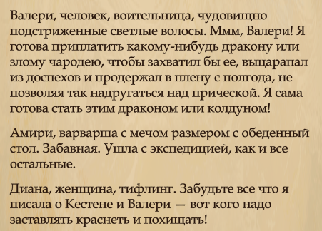 >Чудовище исчезло, и вокруг вновь стало тихо. На столе поднимается пар от свежего печенья и ароматного чая. Арушалай окидывает свою мечту взглядом. Вы никогда не видели на ее лице такой радости. "Я... Просто хочу жить здесь, в мире смертных. С тобой. Я разгадала загадку богини. Вот моя настоящая мечта!"