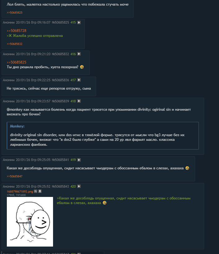 >>50670591 >И вот после таких приколов с катами начинается "ОЙ А ЧО У НАС В ТРЕДЕ НИКТО НИЧЕ НЕ ОБСУЖДАЕТ ОЙ А ЧЕ ТРУТ ЛЮДЕЙ ОЙ НУ Я НЕ СРАЛ НИКУДА Я ИГРЫ ОБСУЖДАЛ". И к чему этот твой нахрюк? Перекат не потерт, шапка без половины игр не исправлена. Пидорас который его высрал для рейдбайтов напукал о своем перекате десятки нерелейтед постов - они тоже на месте. Моче похуй.