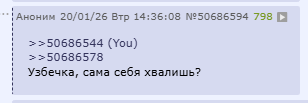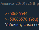 >>50687421 Один из них, этот >>50687365 просто хочет моего внимания Этот >>50687373 , судя по всему, просто скандалить любит Первый, узнав, что все это время кормил вниманием не меня, покинет спор, а второй останется нисчем Бам, конфликт решен