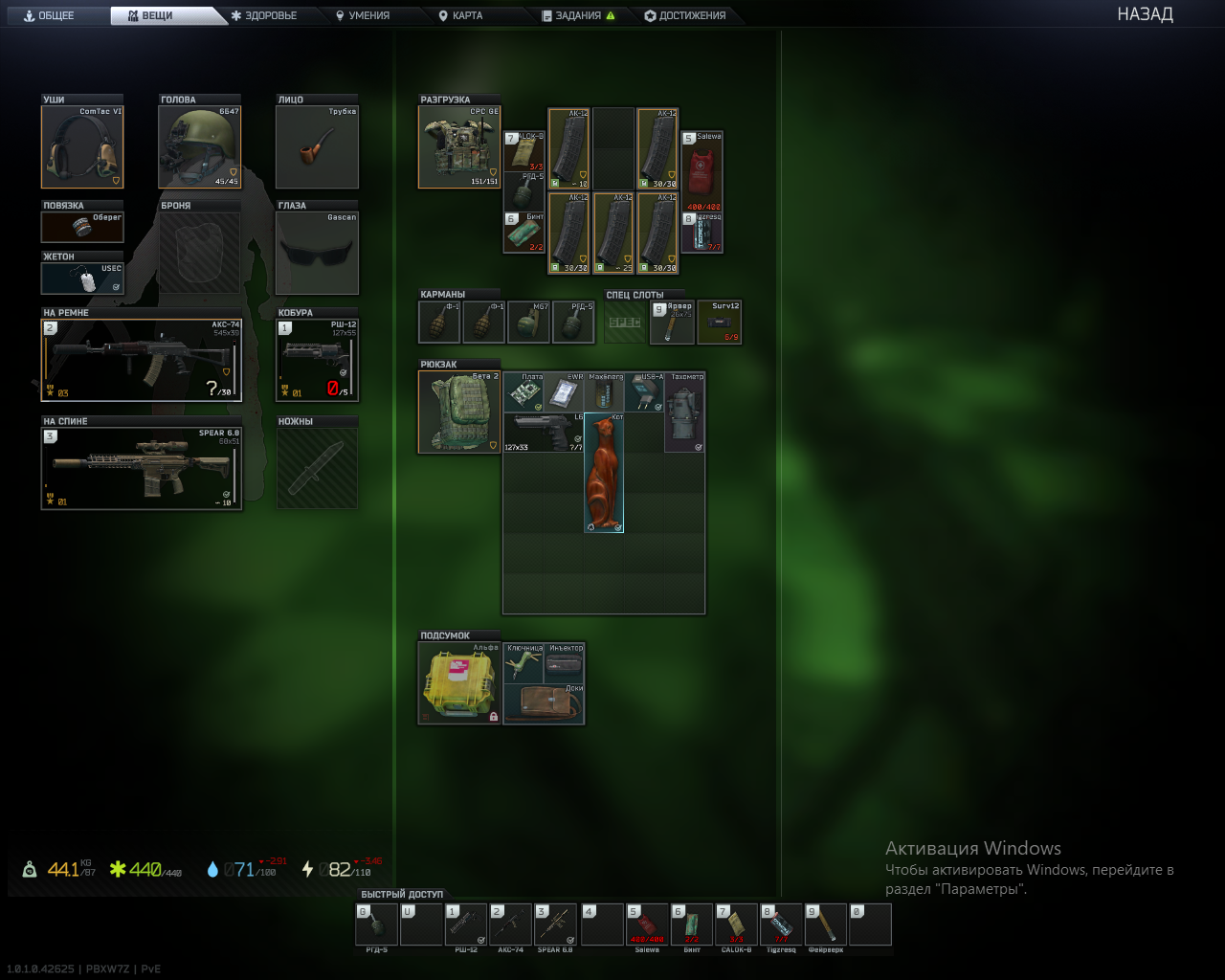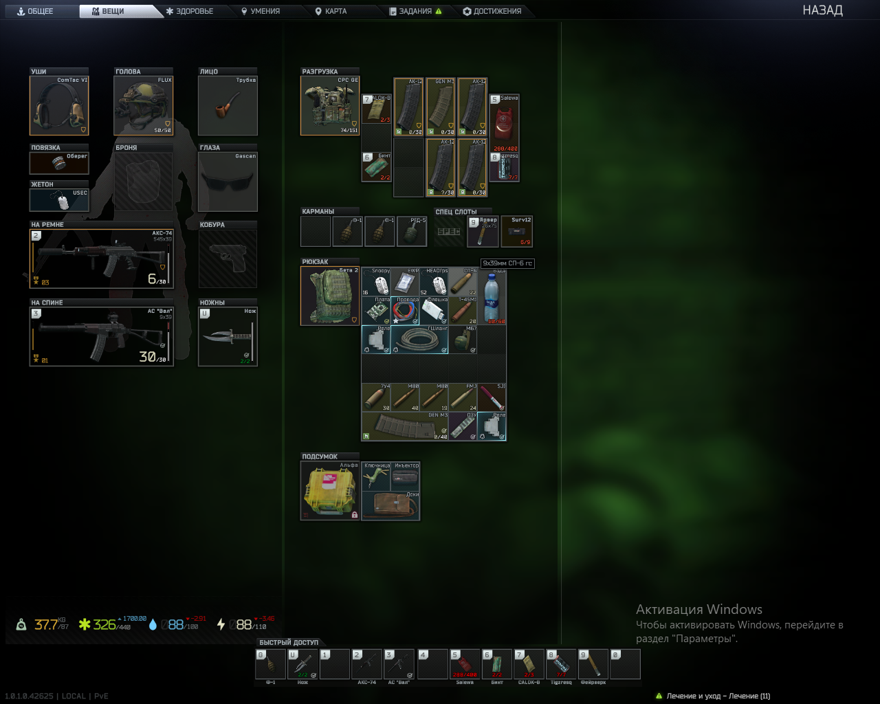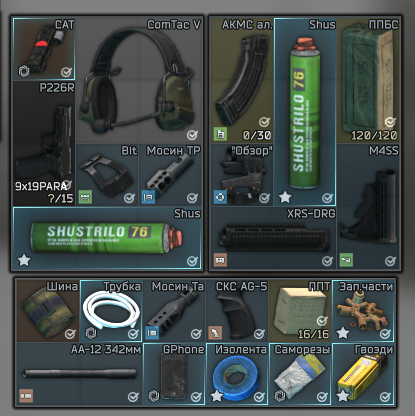 На штурме мемка/ак-12/мсх ЕТГ, перфторан, пропитал, всё это на автоюз. Калок на всякий случай можно, но обычно не нужен. Броник там 4 класс, похуй какой, улач, уши, ну и крутишь это всё, чтобы в метавес влезло, можно на низ магаза говнопатронов вкинуть. Какой-нибудь тримадол, хз, можно, конечно юзать, если метавес позволяет, но у меня не влезает.