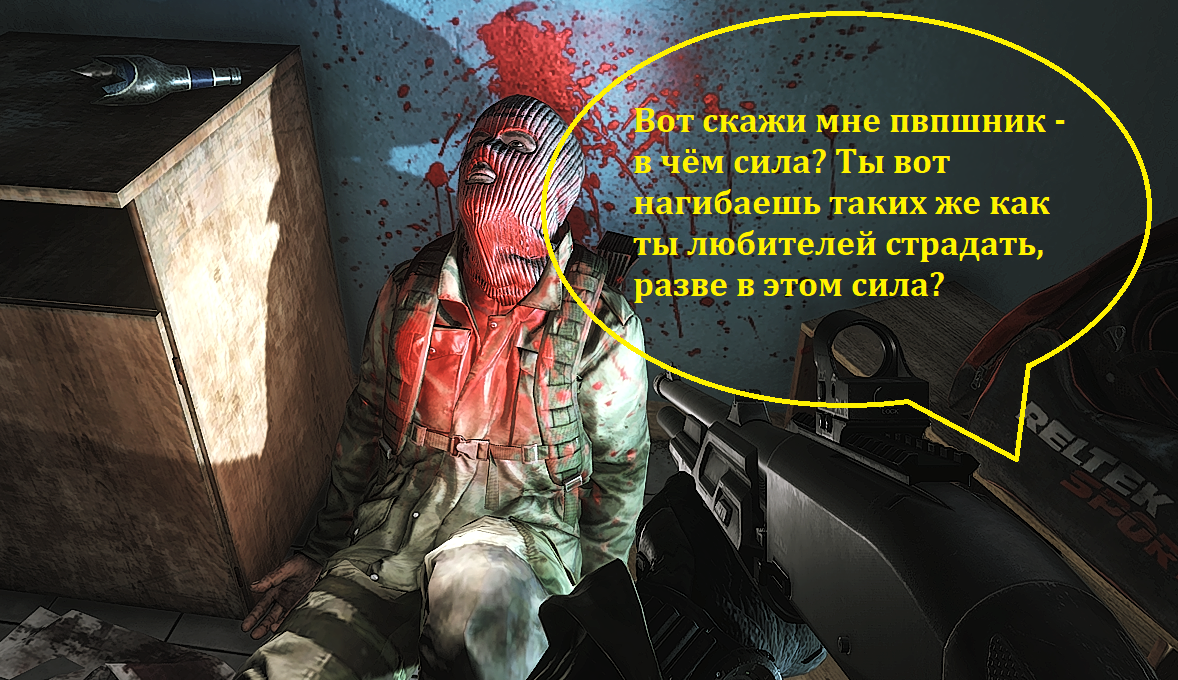 Целиком моя шибка - думал он там один, их оказалось трое. Одного завалил, двое оставшихся запушили. Это в пве конечно. Ну и наклало отпечаток то, что я с дробашём был. С автоматом подебил бы их всех. А ведь всего-то навсего было надо отойти назад, перегрупироваться по сбэувский и заговнячить их нормально. Но нет... я же бессмертный в 6 броне. Поплатился за самоуверенность и тупость. Признаю.