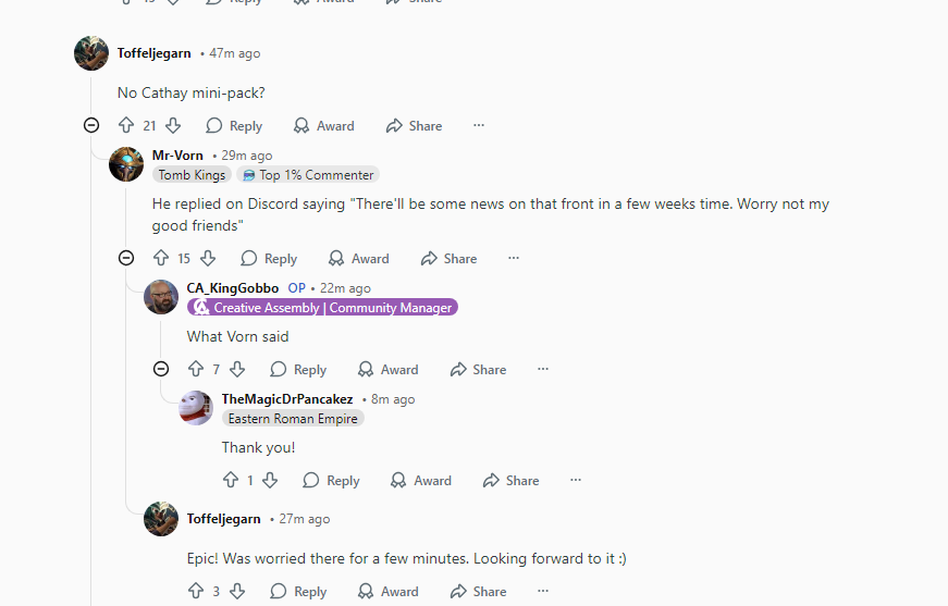 Помимо этого ещё стена текста что на релизе нагаша будет ебейший реворк вампиров и тд, что январьский фикс аи неоч сработал, что осады как-то улучшат и что бретох точно реворкнут. Но не раньше лета.
