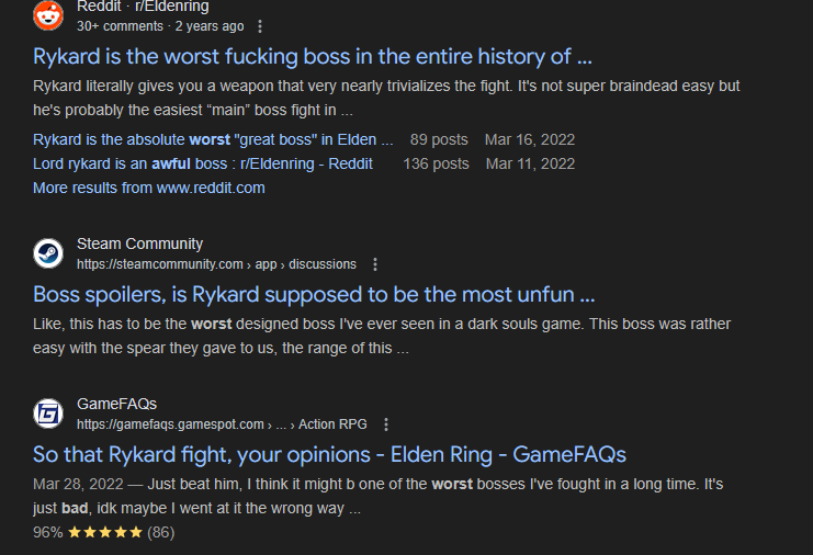 >>50711361 Наблюдал издалека ваш срачик, извини, вчитываться лень. Элден Ринг для многих стала лучшей игрой фромов, в том числе для меня. Можешь хоть усираться, но это факт, подтвержденный отзывами, наградами и продажами.