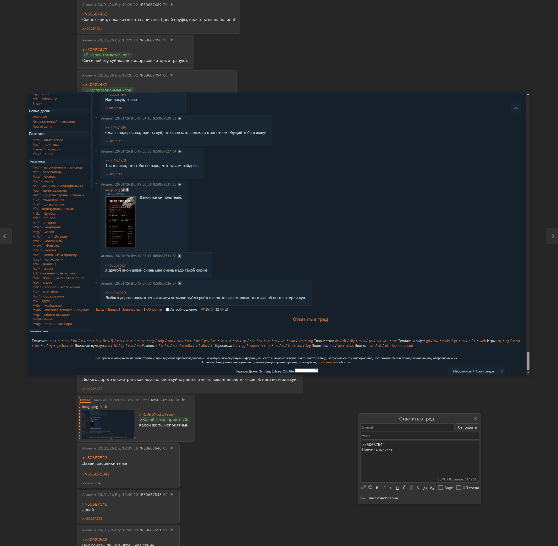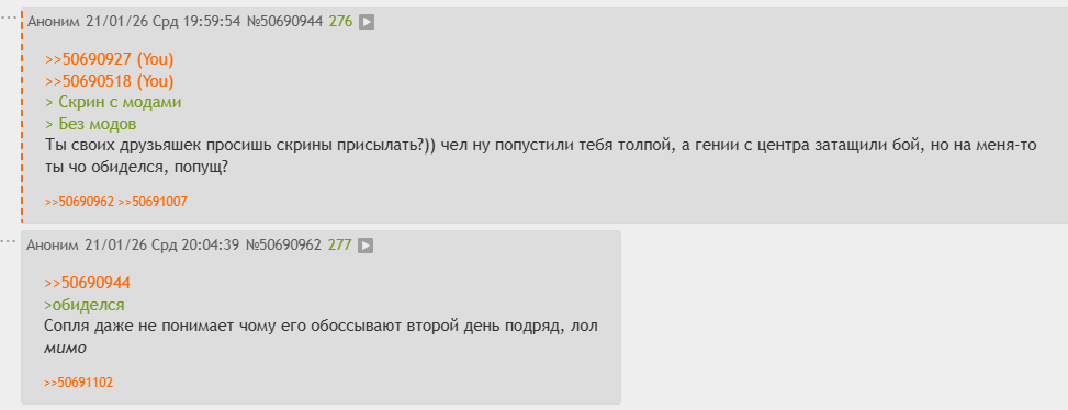 >>50690927 >>50690518 > Скрин с модами > Без модов Ты своих друзьяшек просишь скрины присылать?)) чел ну попустили тебя толпой, а гении с центра затащили бой, но на меня-то ты чо обиделся, попущ?