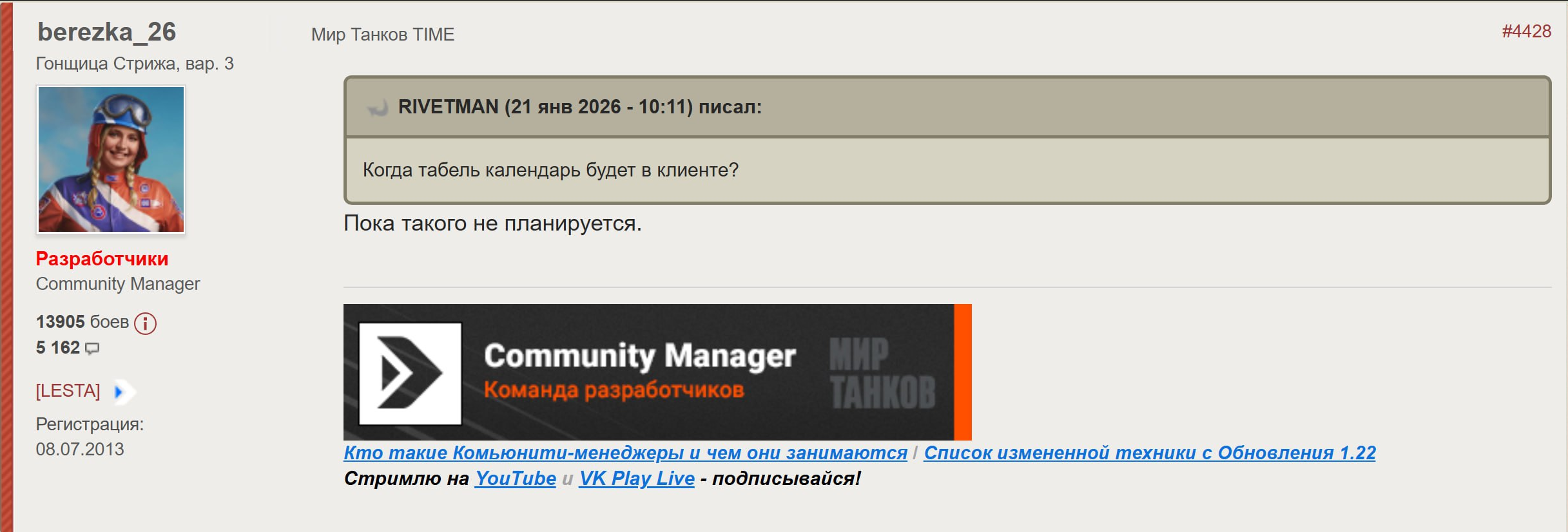 >>50701428 боже, как же у тебя насрано в голове) ты действительно хочешь со мной на эти темы пообщаться, ну так погнали прямо на стриме в дискорд или куда-то там еще, я тебе все обьсню. Смысл мне тебе расписывать все в комменатриях, если ты все равно будешь крутить свою пластинку. Патент кислого существует, но ты без понятия, как он работает. +25% это стандартная механика игры и когда у тебя из 400 среднего вылетает 399 урона - это не открутка, точно так же и до +-25%. Тепловые карты нет, не слышал ниразу. Разные рандомы? Бред, потому как не было бы ниодного не стримера и не блогера, который бы играл на бирюзу-фиолет на своих обычных аккаунтах после поднятия скилла. Открутка при взятии отметок? В чем она заключается? Можешь начать классический бред, что тычки не пробивают, не летят, союзники плохие, а карты не подходящие, я это уже сто раз слышал и разбирал реплеи. Смотришь на игру типочка на 94% отметки и мама родная, как же он фейлит, как в стрельбу, так и в целом отыгрыш. Зато больше всех ныл на открутки 😂 и почему ты меня воспринимаешь, как стримера лесты? из-за контрибьюторской программы? ну ок, 6 лет назад я запустил свои первые стримы с 1 зрителем и 5 подписчиками, еще никак не будучи связанным с лестой. И уже тогда я играл на фиолет после 4 лет игры. Обьямнишь эту теорию заговора, адепт секты открутки? Просто фу, горит уже с вас, в голове мусор. Сидит рыжежелтая херня и ноет на открутки... Играть учись, бестолоч, а не в сказки верь