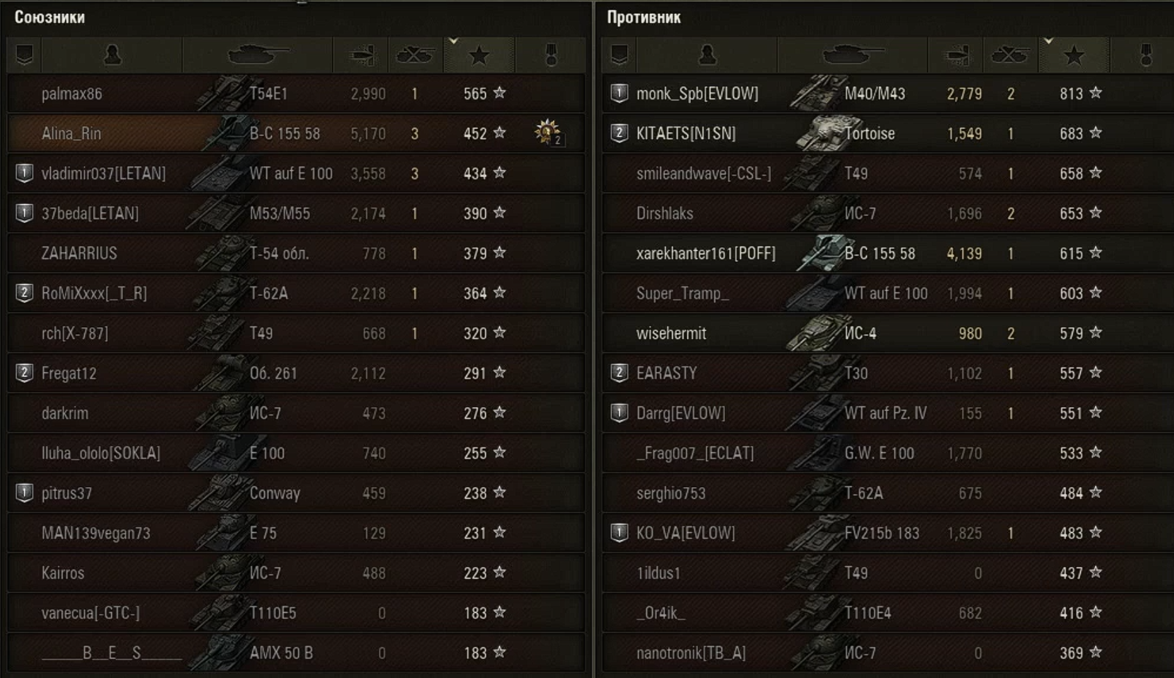 >>50698037 >Ведь есть статисты с винкой в 70%+, а вот реальныъх раков с винкой в 30% в рандоме нету. Даже если просто на респе стоять, то винка процентов 40-45 уж точно будет. Минимальную винки видел 28 или 30%, но не уверен бот это или нет. Хотя тот же бот стоящий тупо афк на базе будет иметь от 40 до 45% в зависимости от уровня боя. >Хотя по логике, разбросы от 50% в обе стороны должен быть примерно одинаковым. По логике да, но на практике это не так. Чтобы иметь винрейт ниже 40% нужно не иронично быть на уровне пиздоты или минимум фиолета с глубоким пониманием как нужно выигрвать бои. Даже клан очко взводом из трех человек поставили рекорд что то вроде 10 или 15% винрейта руиня бои.