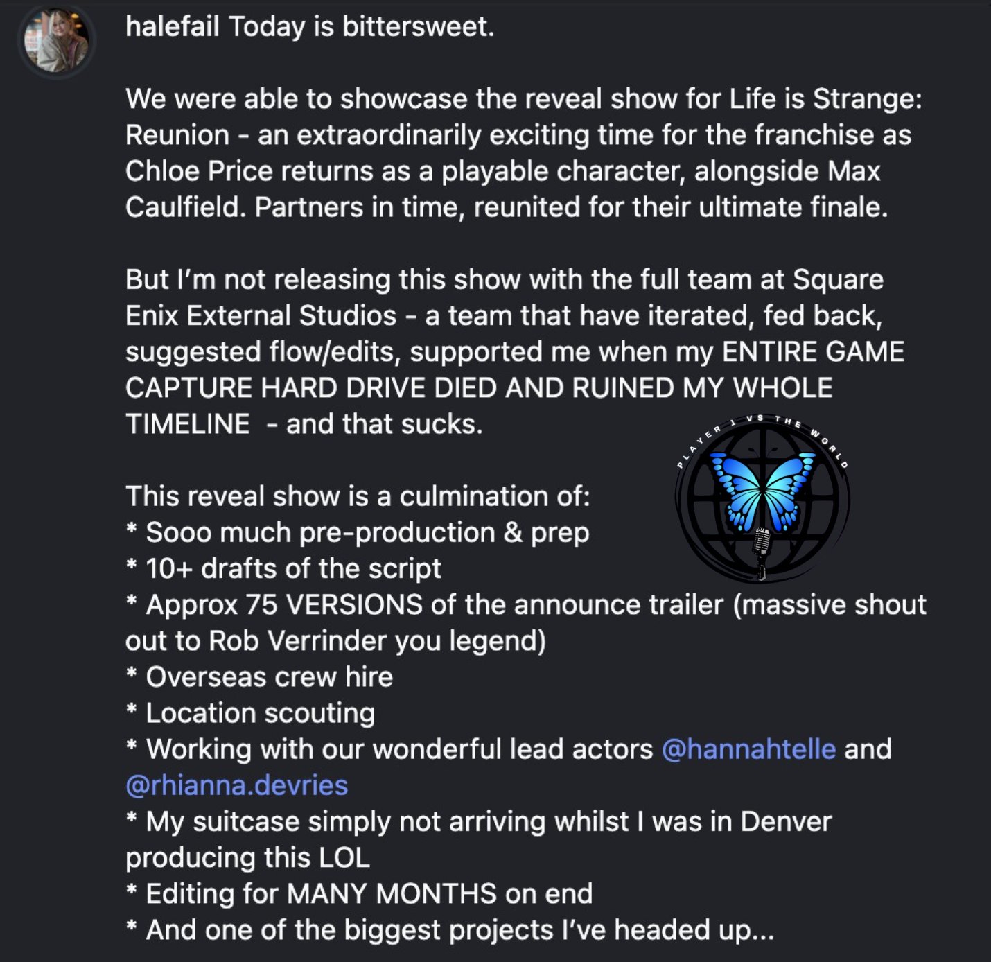 Square Enix brand video creator Lucy Hale with her reaction to Deck Nine's Life Is Strange: Reunion (she was the narrator in the live stream, BTW). ✍️ 🗣️ "But I’m not releasing this show with the full team at Square Enix External Studios [...]."