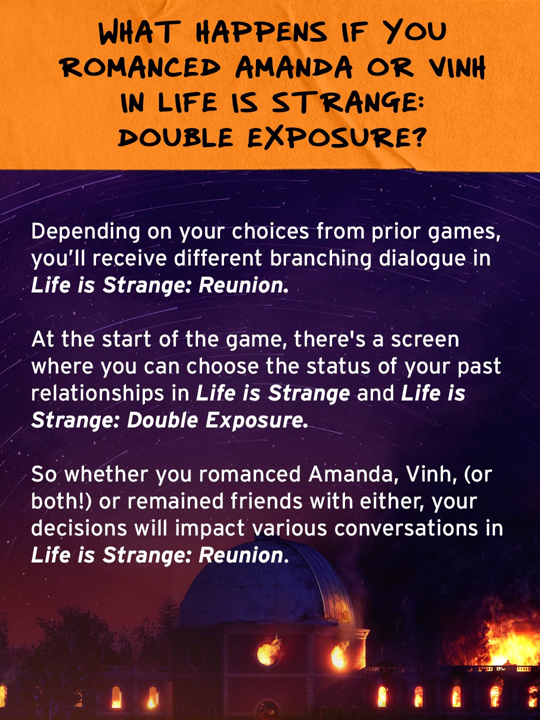 Double Exposure binary choice is even more brazen in how little it matters, as Safi will leave regardless if you sided with her or not and the final bar conclusion will be always the same with Max at the bar. And as we have seen, none of the choices you made with those characters will matter much; Gwen will not be in Reunion regardless if you helped her to stay, DE, Yasmin is going to resign and a new president will be at Caledon no matter what, and both Vinh and Amanda are not going to be romance options.