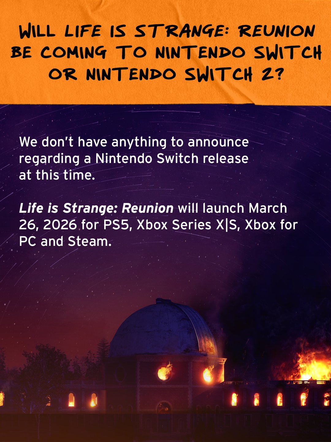 Подробности встречи поклонников Life is Strange: Это будет завершением саги о Максе и Хлое. — Макс и Хлоя — оба играбельные персонажи. - Возвращается способность Макса к перемотке времени — Способность Хлои «Держать в ответ» возвращается. — Релиз игры состоится 26 марта 2026 года. - Игра выйдет на PS5, Xbox Series X/S и ПК через Steam. — Джонатан Циммерман, сценарист игры Before The Storm, возвращается, чтобы помочь в написании сценария этой игры. Действие происходит в Каледонском университете. - Содержит 3 различных издания (стандартное, делюкс и двойное). — Разгадайте тайну поджога Каледонского университета. — Сейчас Хлоя работает менеджером гастролирующей группы Drugstore Makeup. - Отношения Макса и Хлои будут лежать в основе сюжета. — В этой игре вы определяете, как будут развиваться их отношения. - Саундтрек включает в себя как ностальгические, так и новые лицензированные треки. — Многие вернувшиеся персонажи — из фильма «Двойная экспозиция». - Судьба многих персонажей будет зависеть от ваших решений. - Игра не является эпизодической. - У игры не будет периода раннего доступа. - Игра может выйти на Nintendo Switch некоторое время спустя после запуска.