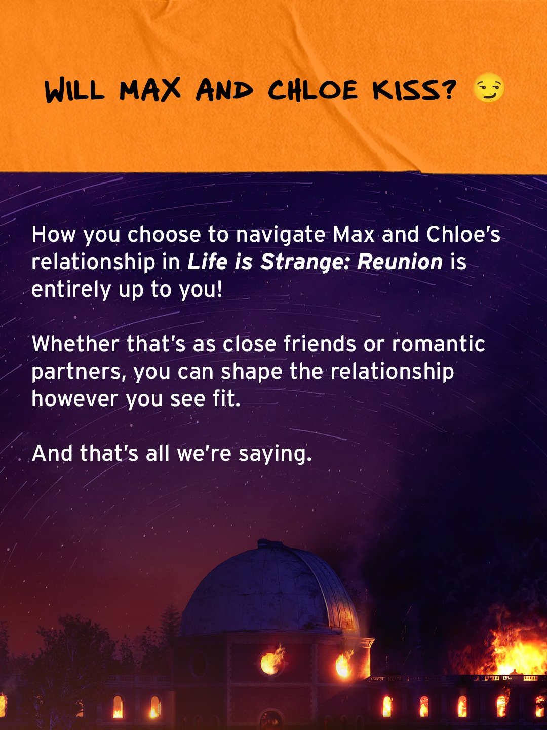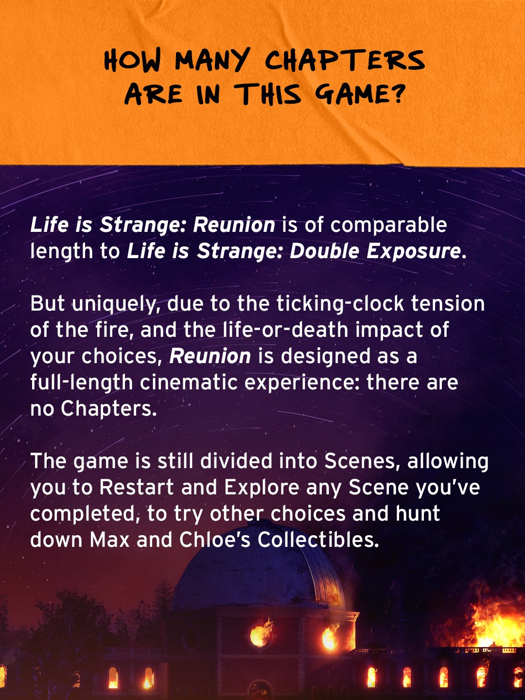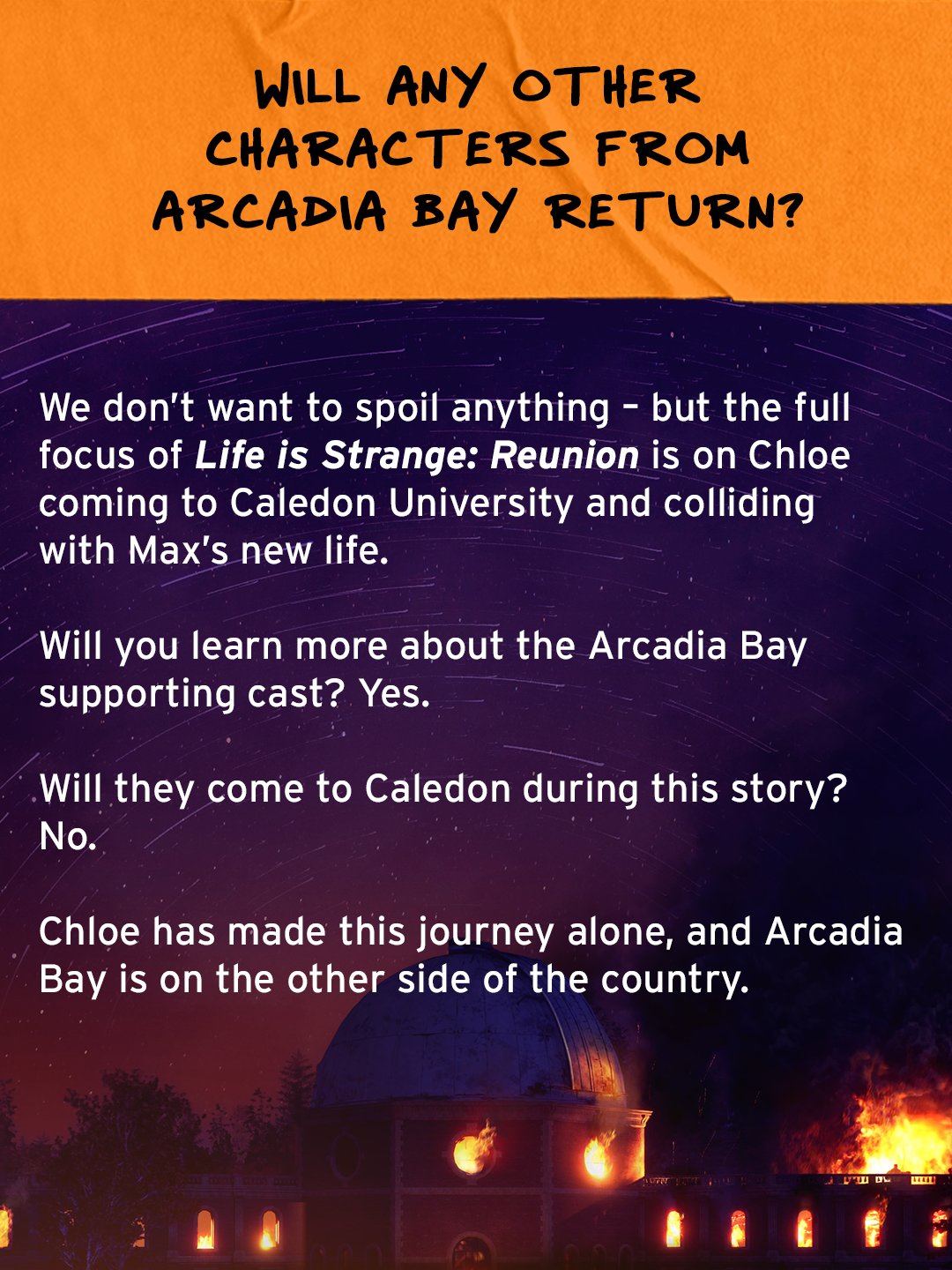 "Life is Strange Reunion" synopsis: Chloe Price was Max Caulfield’s partner in time… Losing her is Max’s greatest regret. Now Chloe has come to Caledon University. Haunted by nightmares and impossible memories, Chloe needs Max’s help. But Max is already in crisis: in three days, a deadly inferno will destroy the campus. Max’s Rewind power has bought her time – but she can’t prevent the blaze alone. The fire will force Max and Chloe to make devastating decisions. Can they find a future together… Before everything burns?