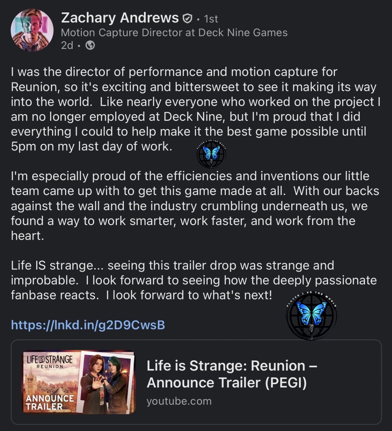Андрес Ортис Суарес, ведущий дизайнер Life Is Strange: Reunion, предположил, что в Deck Nine ожидаются новые сокращения штата по мере "завершения проекта".