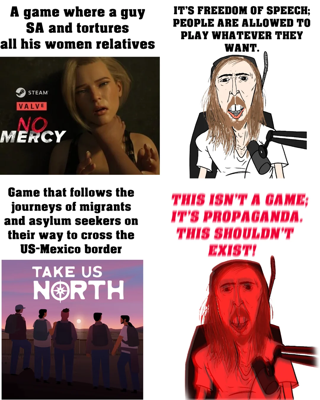 >>50699089 >вся завязка Похуй на завязку, в первой части вся завязка на том, что мужик-сексист убивает женщин, а концовочка тоже про то же! Завязка там на том, что крупный булли буллит мелких, а затем коп-руки видит толпу каких-то людей в крови, один из которых идёт на него с неясными намерениями. Хз кем надо быть чтобы абсолютно во всём видеть расовый подтекст, американцем наверное. >соевый куколд спасает мексов, потому что он не анти-расист Это вообще пушка, я даже не знаю как это комментировать. В очередной раз подтверждает, что проблемами расы обеспокоены только пришибнутые шизики. Хиллбили из 4 эпизода, конечно, были пиздец карикатурными, но повторюсь, таких сцен - по 5 минут на эпизод в крайнем случае, и сводить к этому весь смысл игры - это пиздец каким ущербным быть надо.