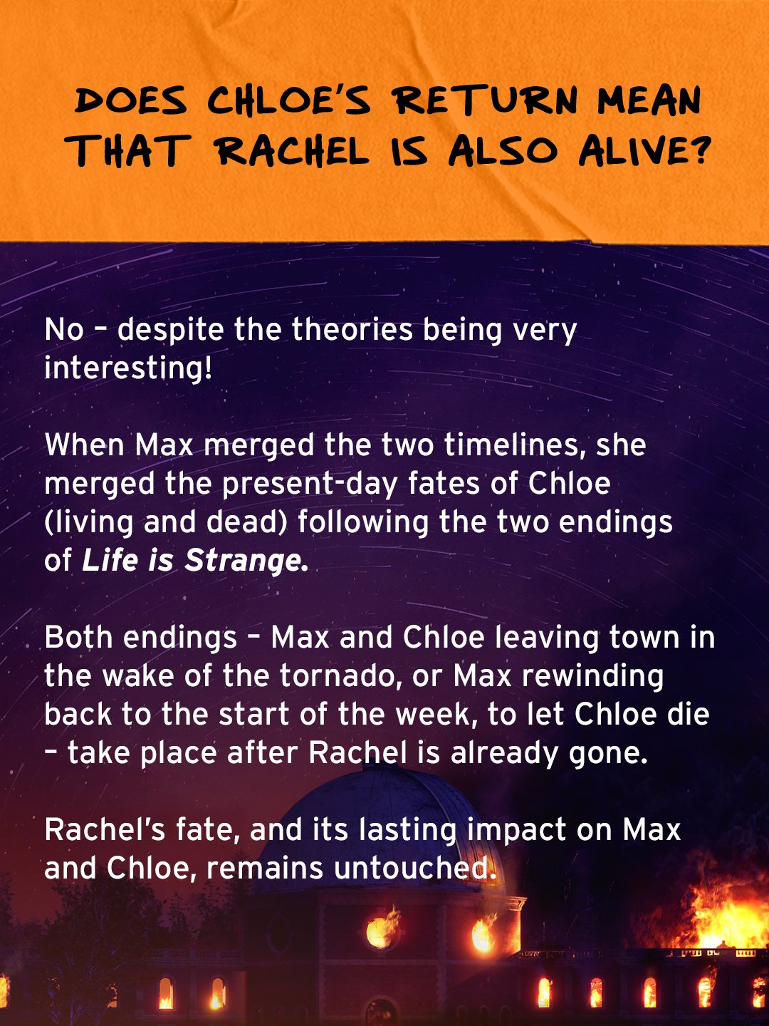 Before the Storm dual endings are ultimatelly pointless, as managing to have Rachel met her biological mother or not telling her anything won't matter or will be relevant for the original Life is Strange, as Rachel will always end up groomed by Mark Jefferson.