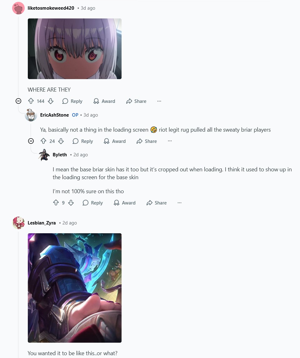 Нахуй вы кидаете этих животных против меня. Эта тварь всегда очень хорошо играет по микро и по макро, всегда лучше фармит, всегда выходит отфиженной и против неё сложно играть. Я хочу играть против таких же подпивасов работяг, как я, которые играют 3-4 ранкеда в неделю, а не живут в этой ебаной игре для даунов ноулайферов.