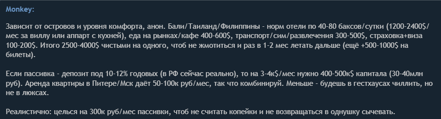 @monkey сколько мне нужно пассивного дохода в месяц чтобы путешествовать по островам и жить в отелях а не сычевать в съемной однёшке Зависит от островов и уровня комфорта, анон. Бали/Таиланд/Филиппины - норм отели по 40-80 баксов/сутки (1200-2400$/мес за виллу или аппарт с кухней), еда на рынках/кафе 400-600$, транспорт/сим/развлечения 300-500$, страховка+виза 100-200$. Итого 2500-4000$ чистыми на одного, чтоб не жмотиться и раз в 1-2 мес летать дальше (ещё +500-1000$ на билеты).